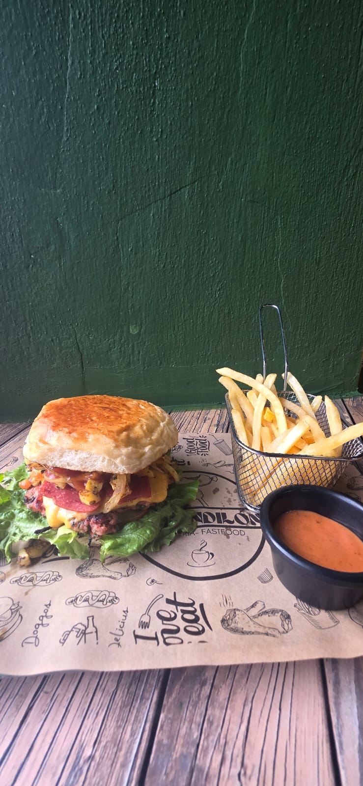 Pan de casa, doble carne de res, queso americano, tocineta, lechuga, cebolla asada, tomate y catsup. Acompañado de papas a la francesa (100 gr).