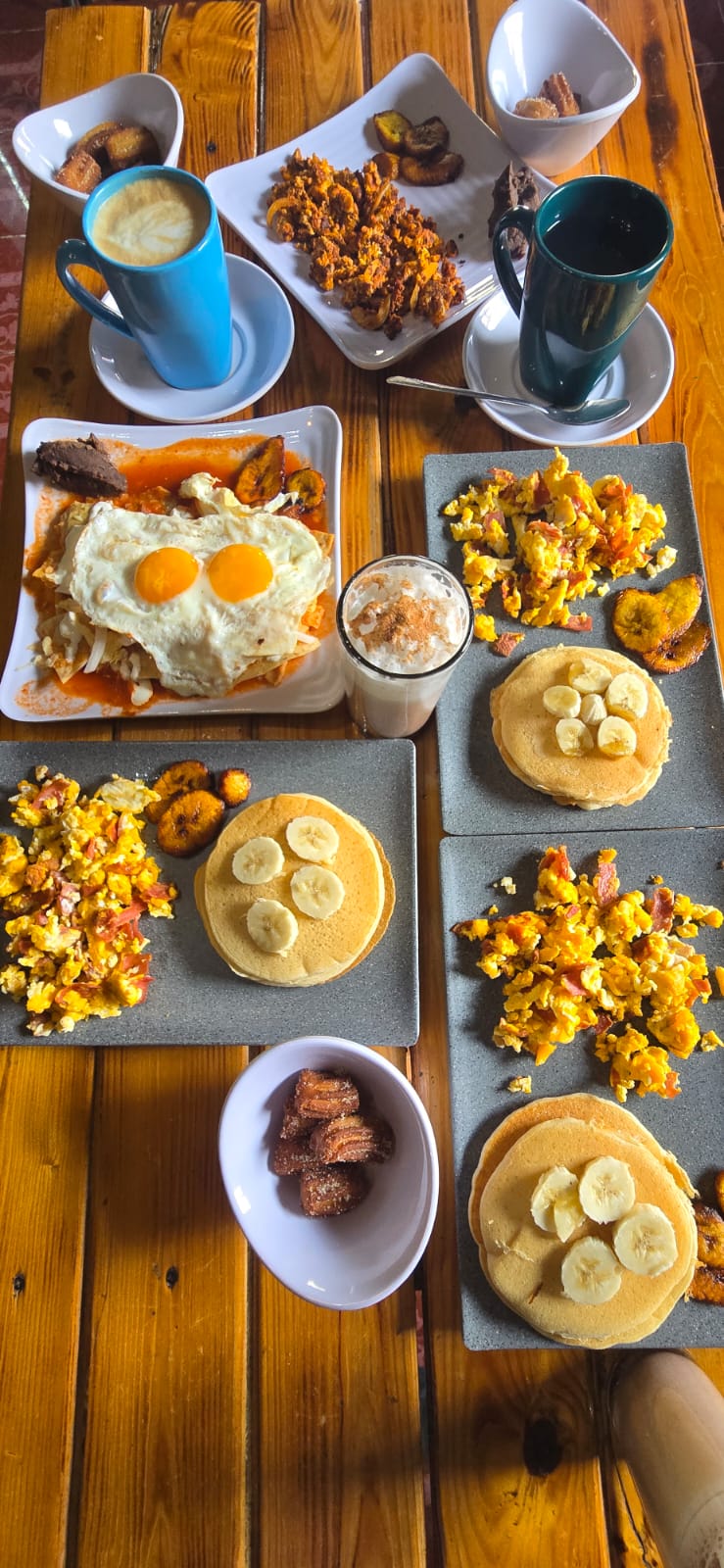2 Huevos con espinaca acompañado de ensalada de: lechuga romana, tomate, cebolla, aguacate. Incluye bebida (café, té o jugo), plátano frito, frijoles, tortilla y 5 mini churros.