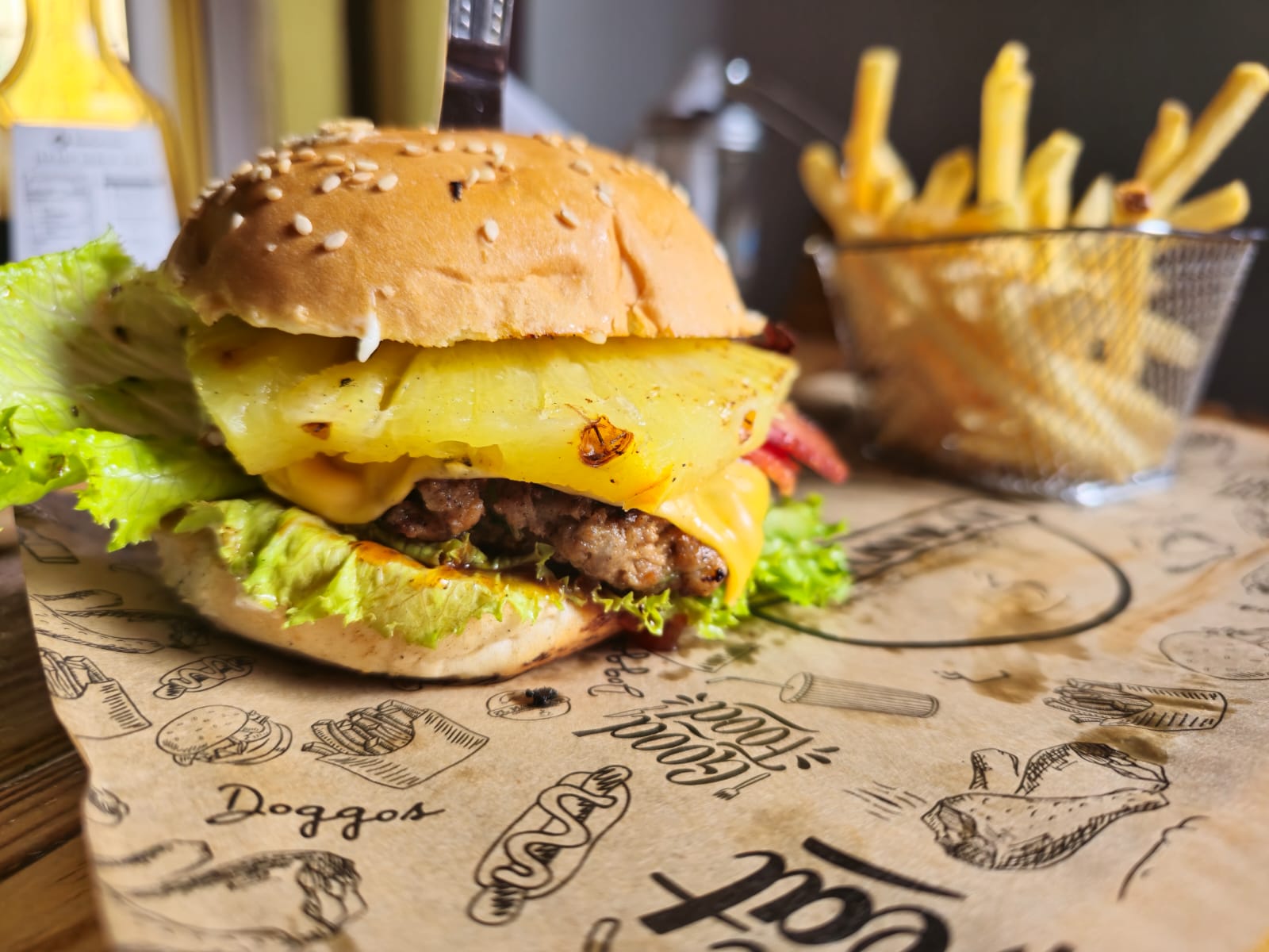 Pan artesanal, carne de res, queso americano, lechuga, cebolla, tomate, mayonesa, catsup, piña, jamón.