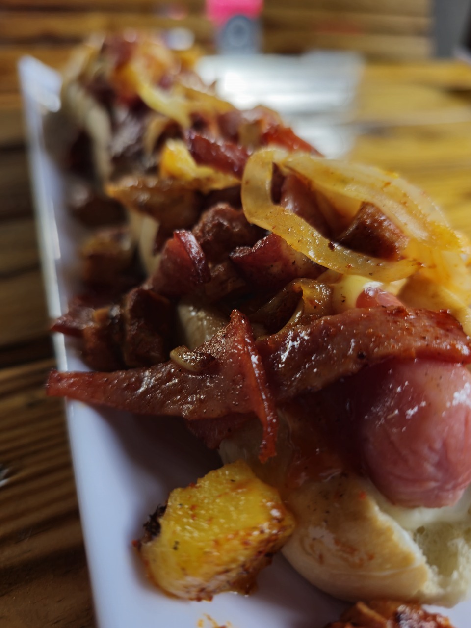 Pan de casa, salchicha de pavo, queso cheddar, catsup, mayonesa, cebolla, y costra de quesos con peperonni tocineta y piña