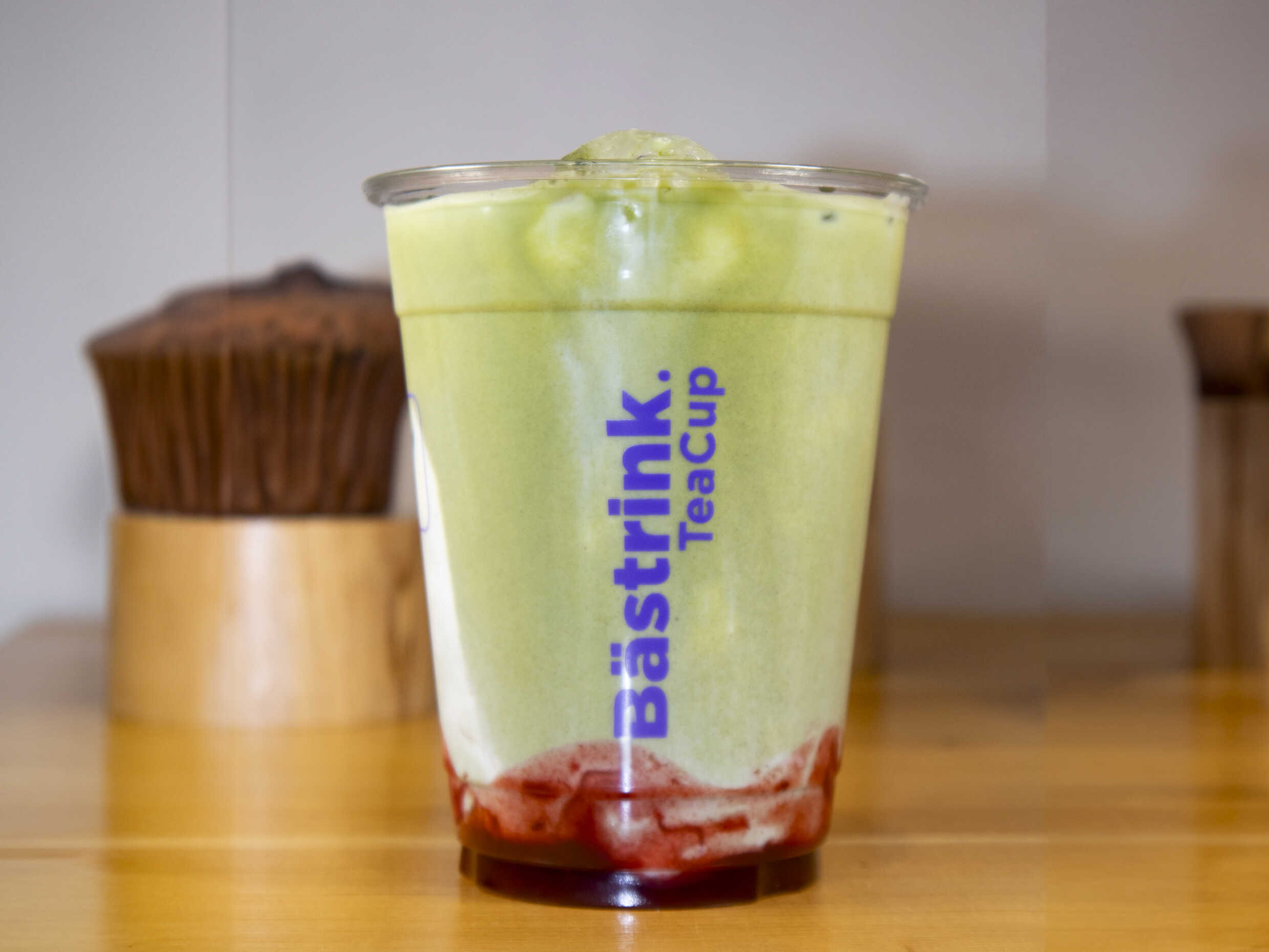Nuestro Matcha Latte combinado con una deliciosa pulpa de fresas.