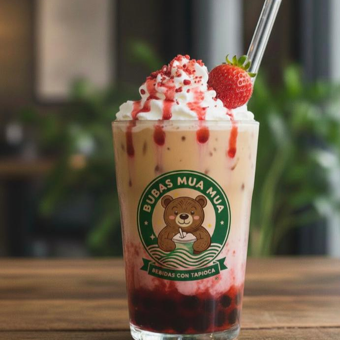 BEBIDA FRAPEADA A BASE DE LECHE, FRESA, JARABE DE FRESA, CREMA PASTELERA Y TAPIOCA