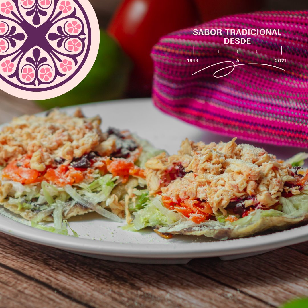 Tostada con frijol, lechuga, betabel, zanahoria, proteína y queso.