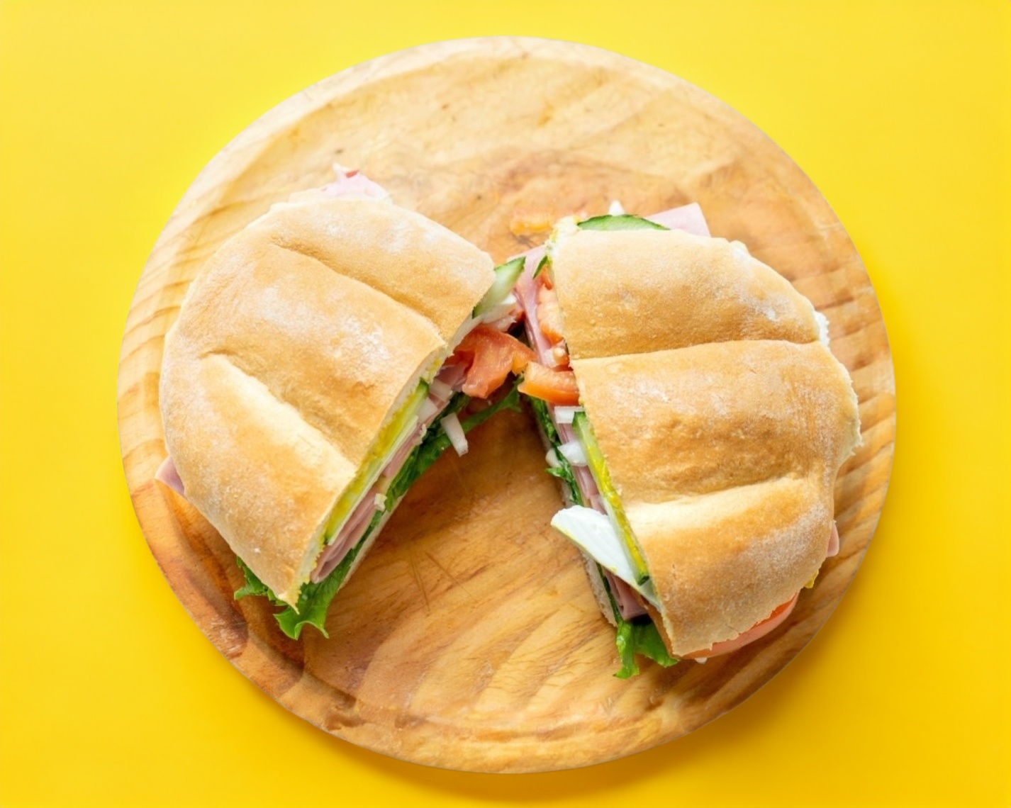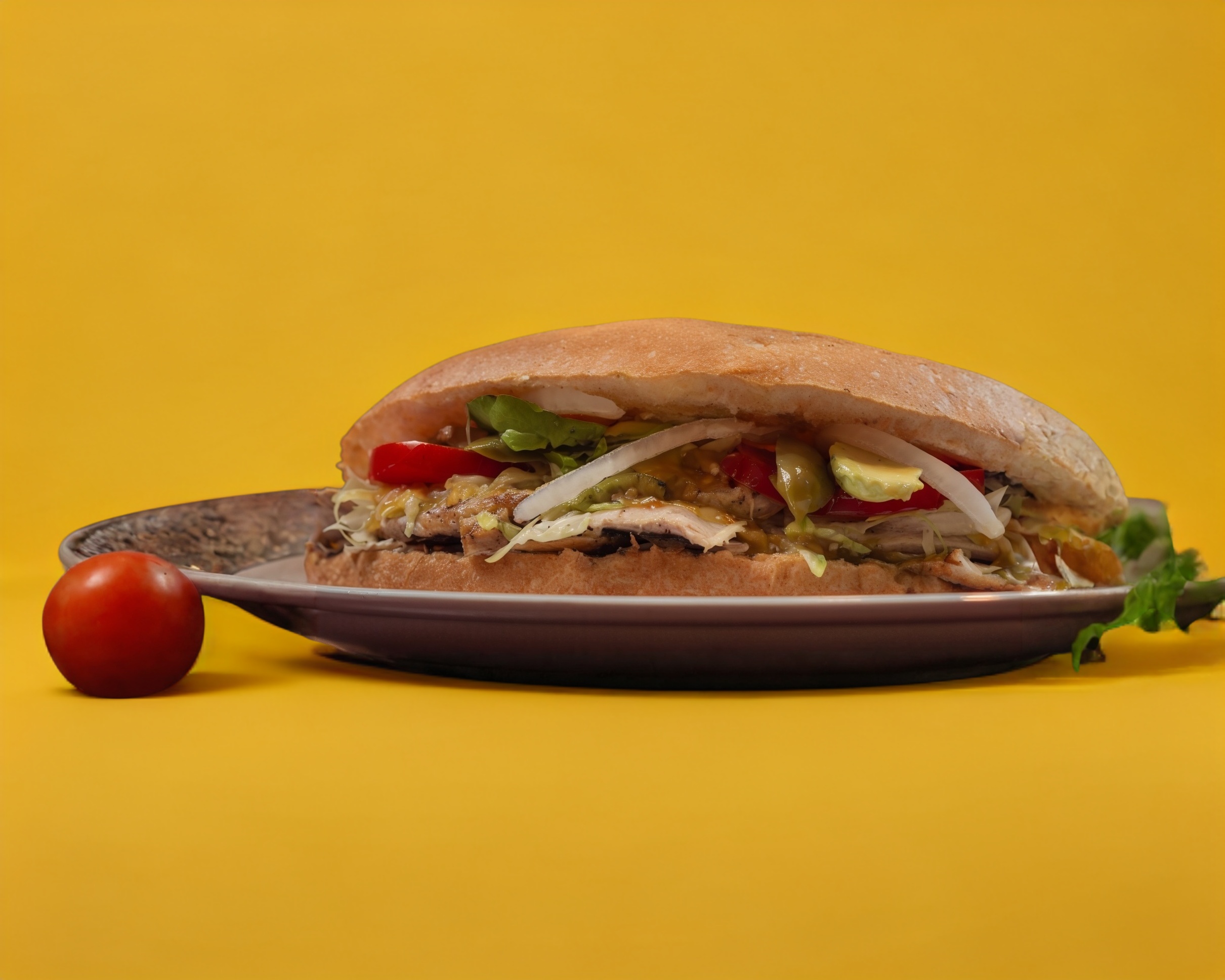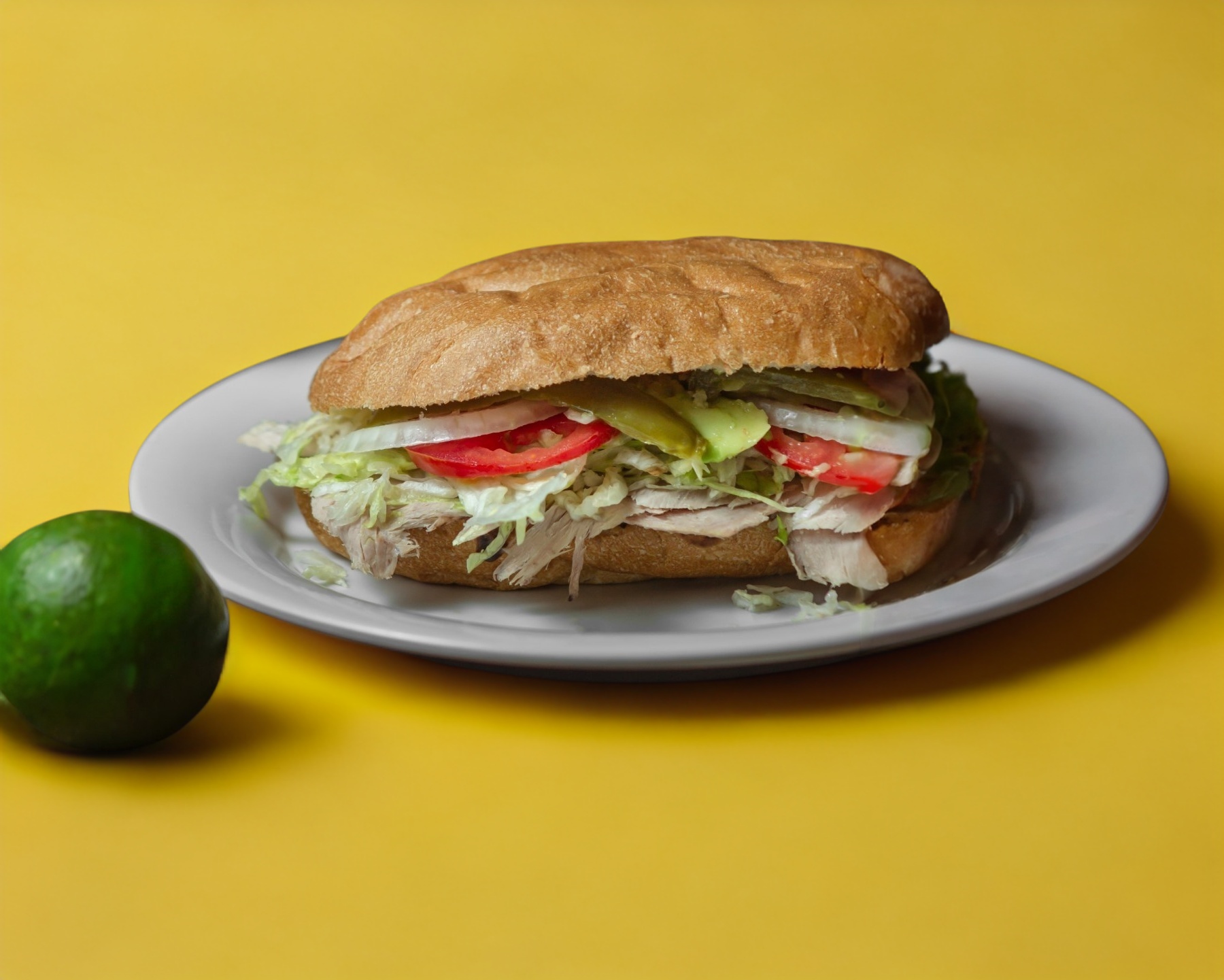 Pan relleno con jamón, queso, lechuga, tomate, cebolla, aguacate, mayonesa y chiles en rajas.