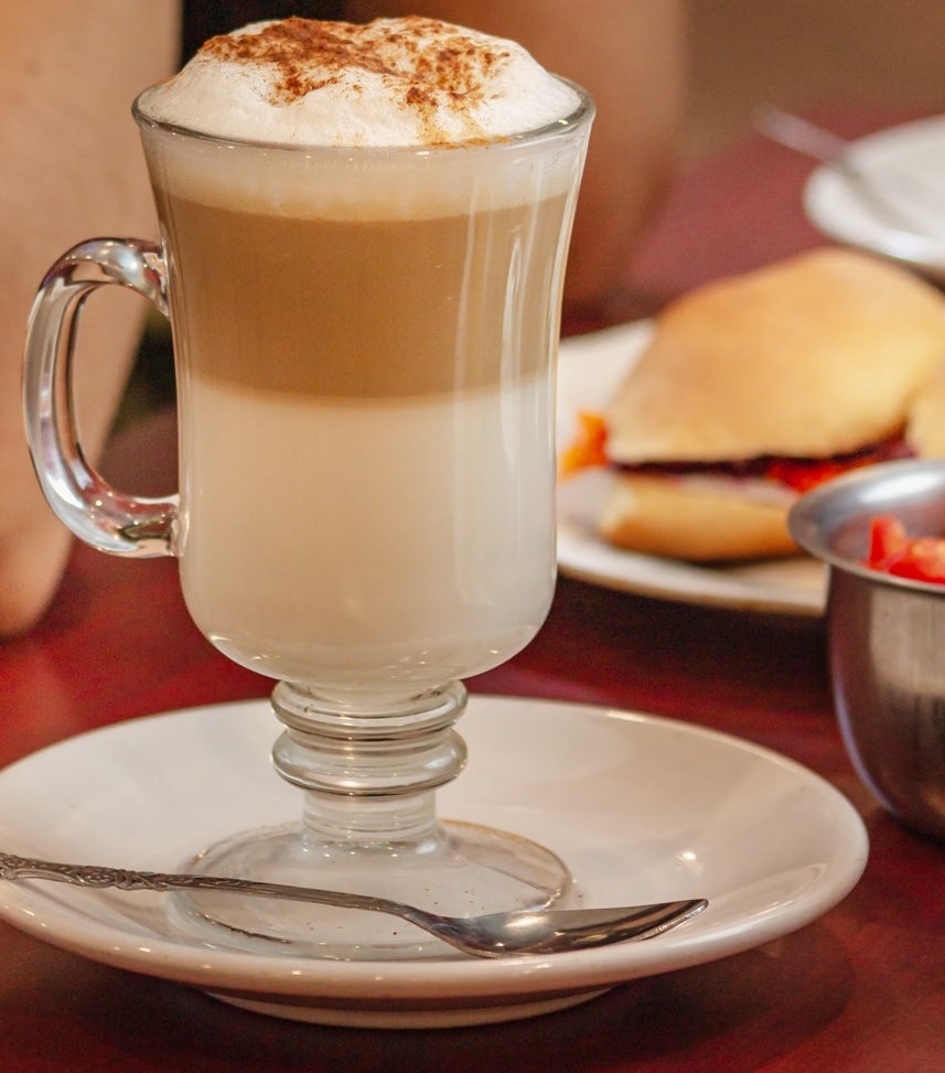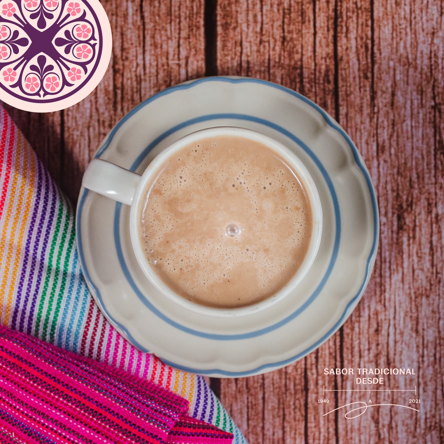 Bebida caliente elaborada a base de maíz, leche, chocolate, azúcar y canela.