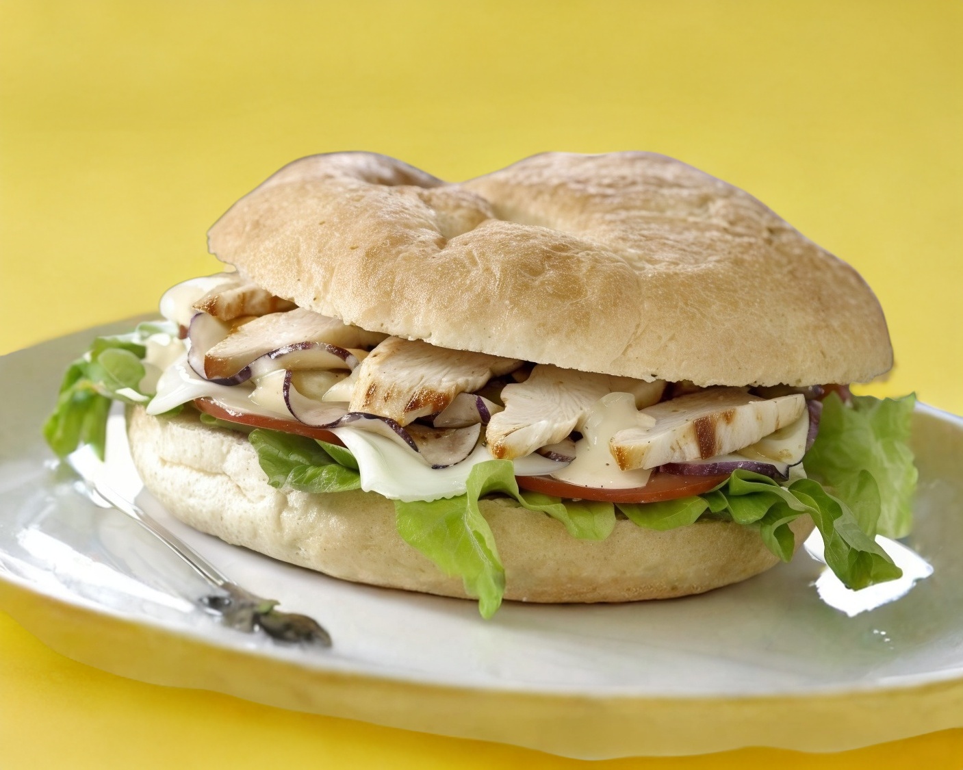 Sándwich con doble piso, cortado en 4 partes. Relleno con jamón, pollo, queso manchego, lechuga, tomate, cebolla, aguacate, mayonesa y chiles en rajas.