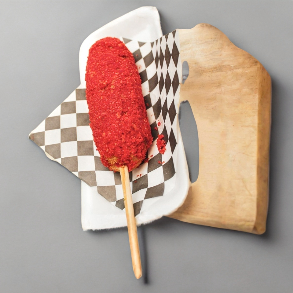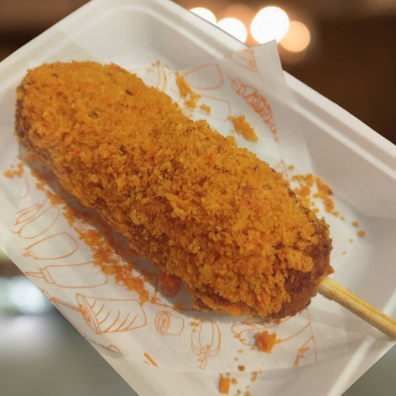 banderilla estilo coreana con relleno a elección y frita, forrada con panko y Takis Fuego