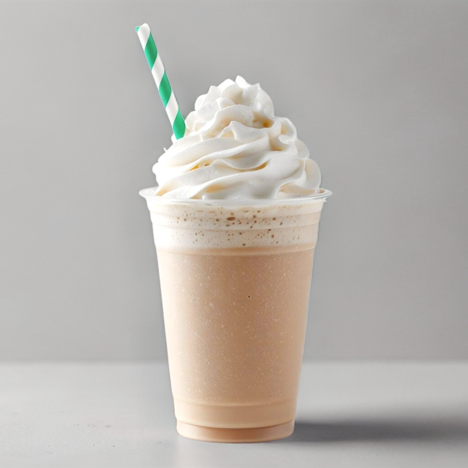 Bebida fría elaborada con leche deslactosada y gansito decorada con crema batida