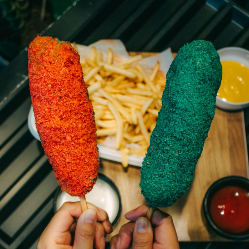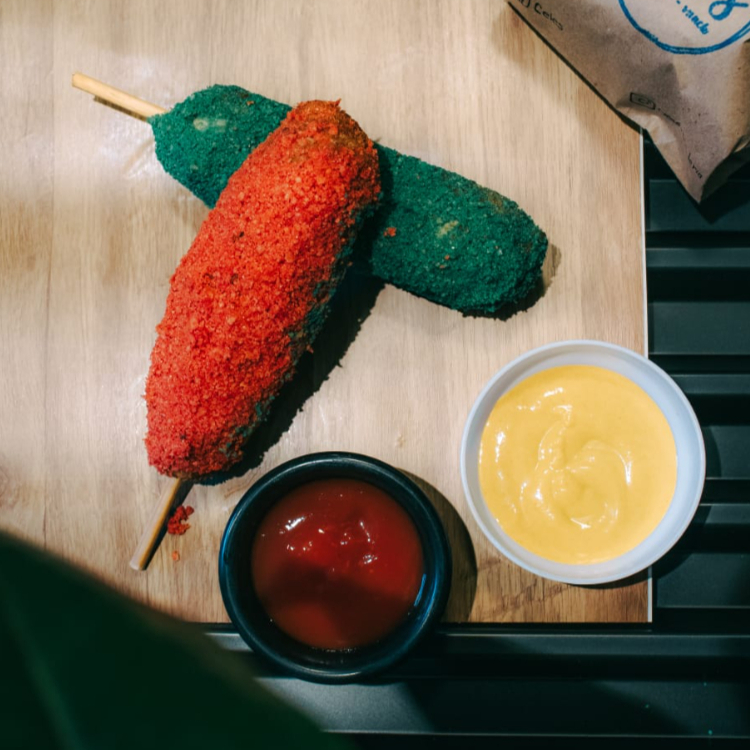 Banderilla estilo coreana con relleno a elección frita, forrada con panko y Doritos Nachos
