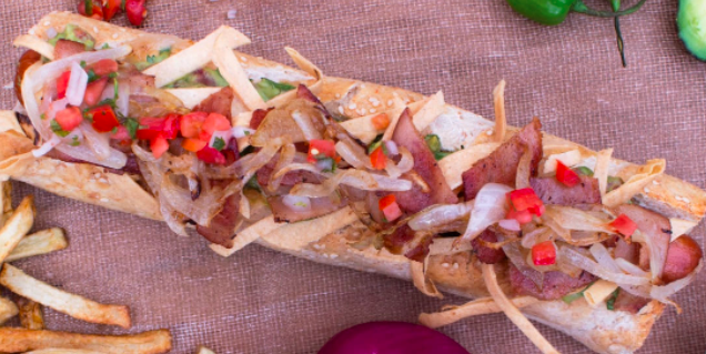 Perro calientes de salchicha frankfurt de 30 cm, con pan horneado en casa y papas a la francesa; guacamole órganico, cebolla asada y tocino.