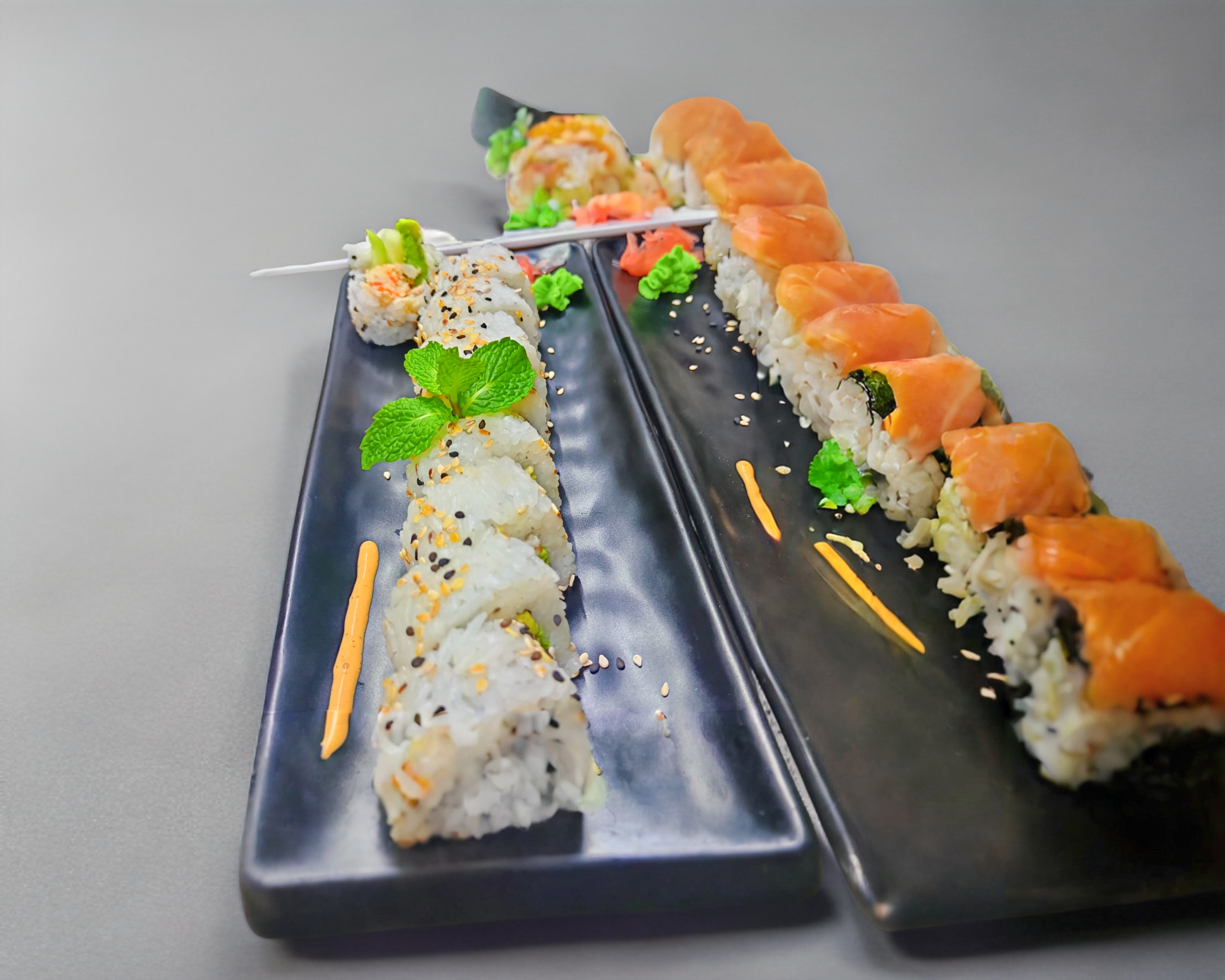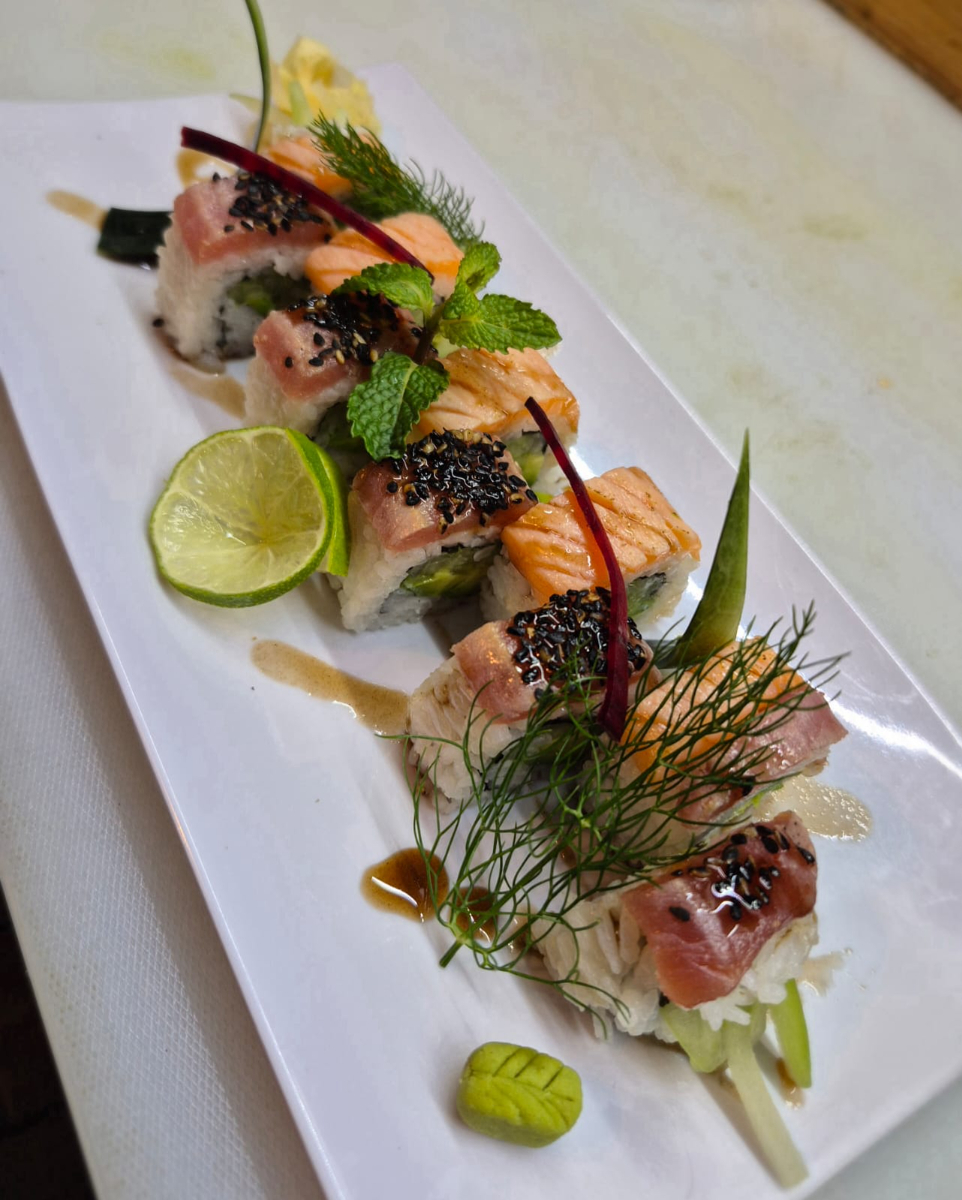 Adentro: pepino, aguacate. encima : atún flameado y salmón fresco, acompañado de jengibre curtido y wasabi
