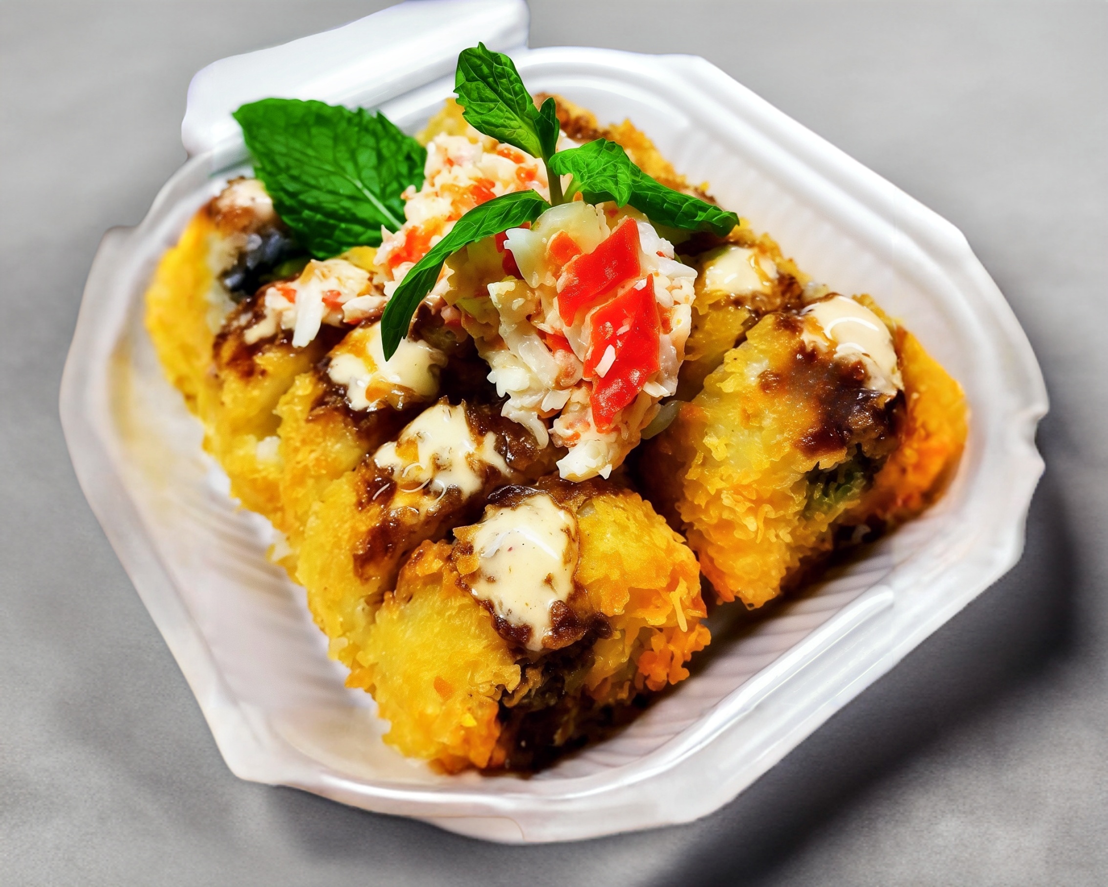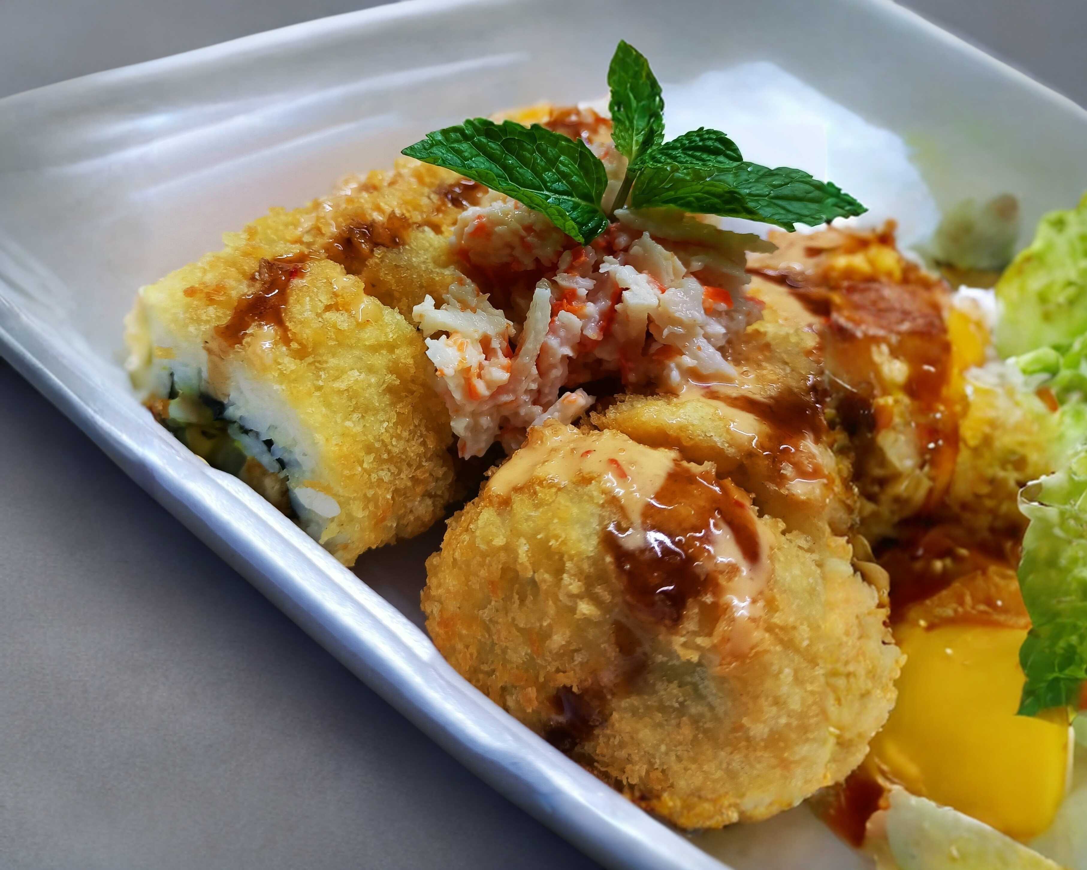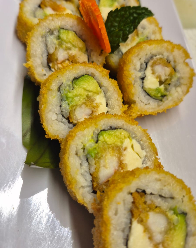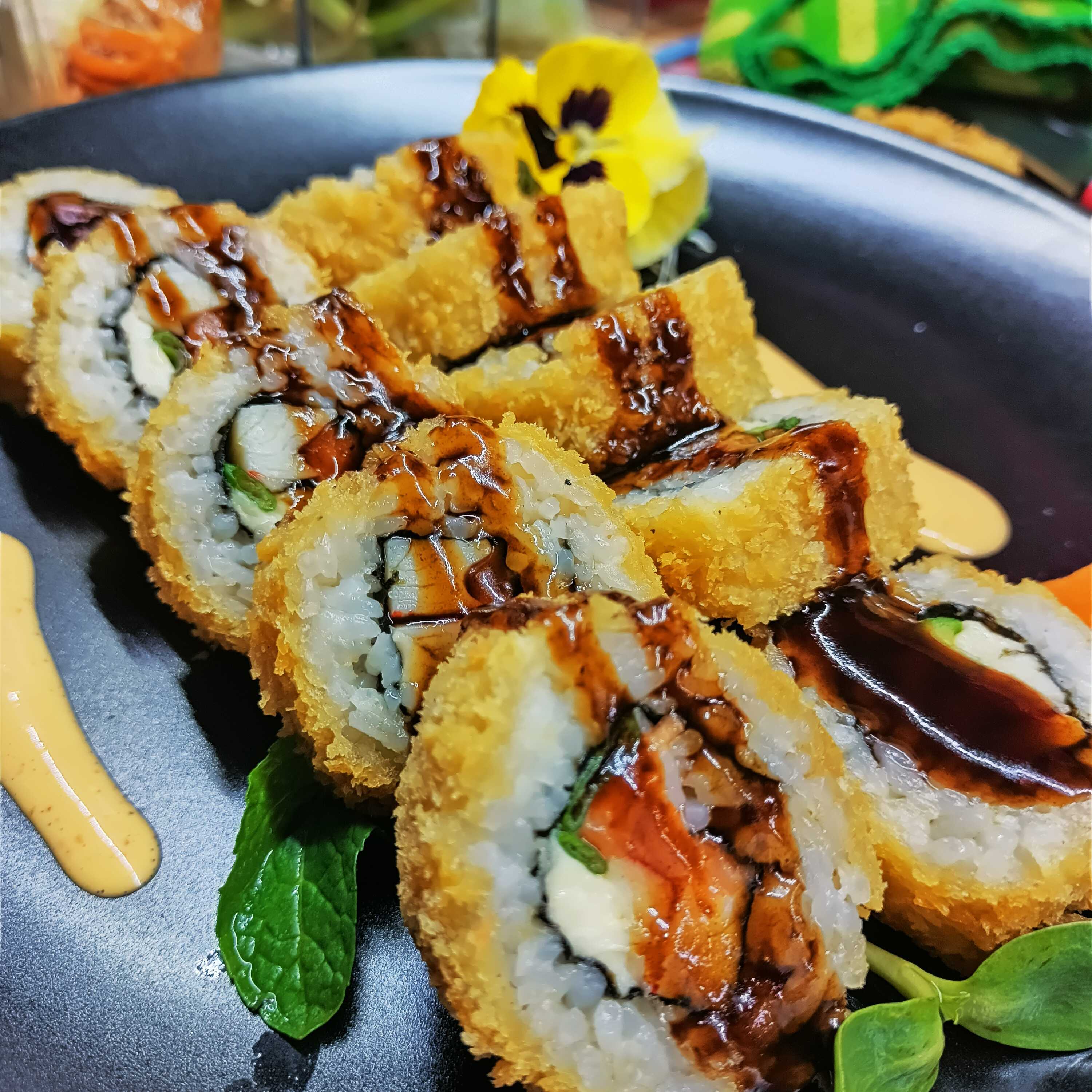 relleno de Plátano frito, aguacate, queso crema, frito en tempura con salsa teriyaki.