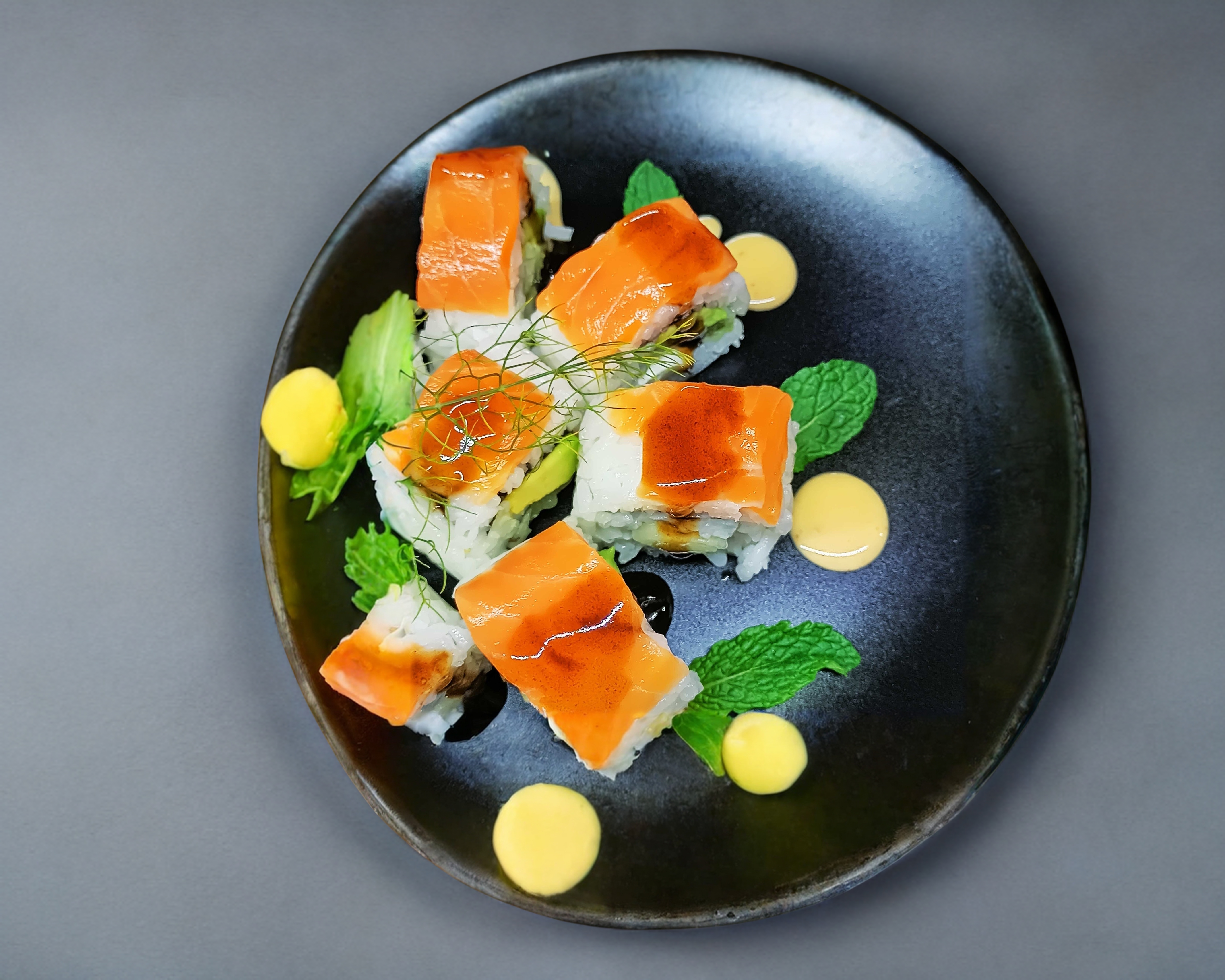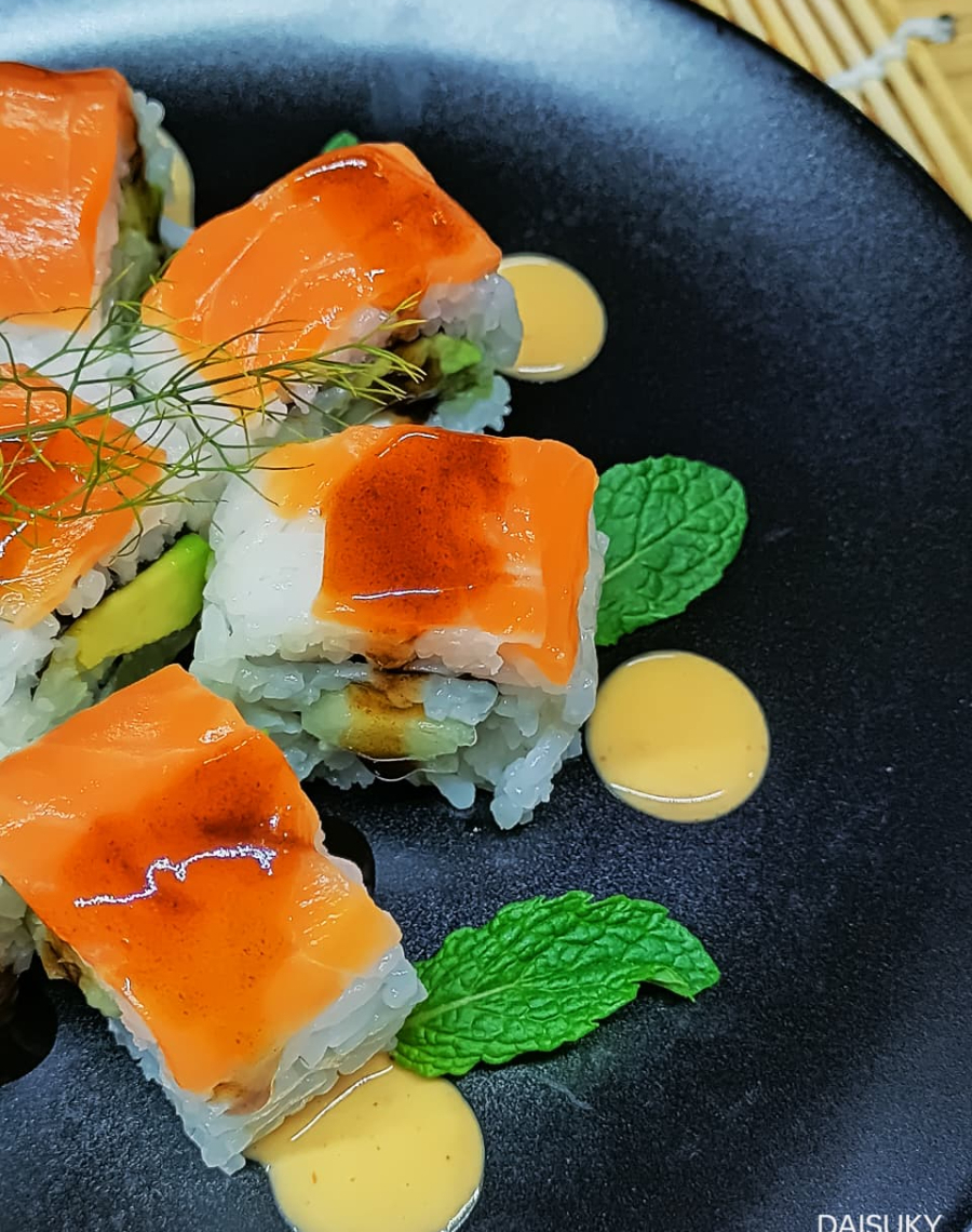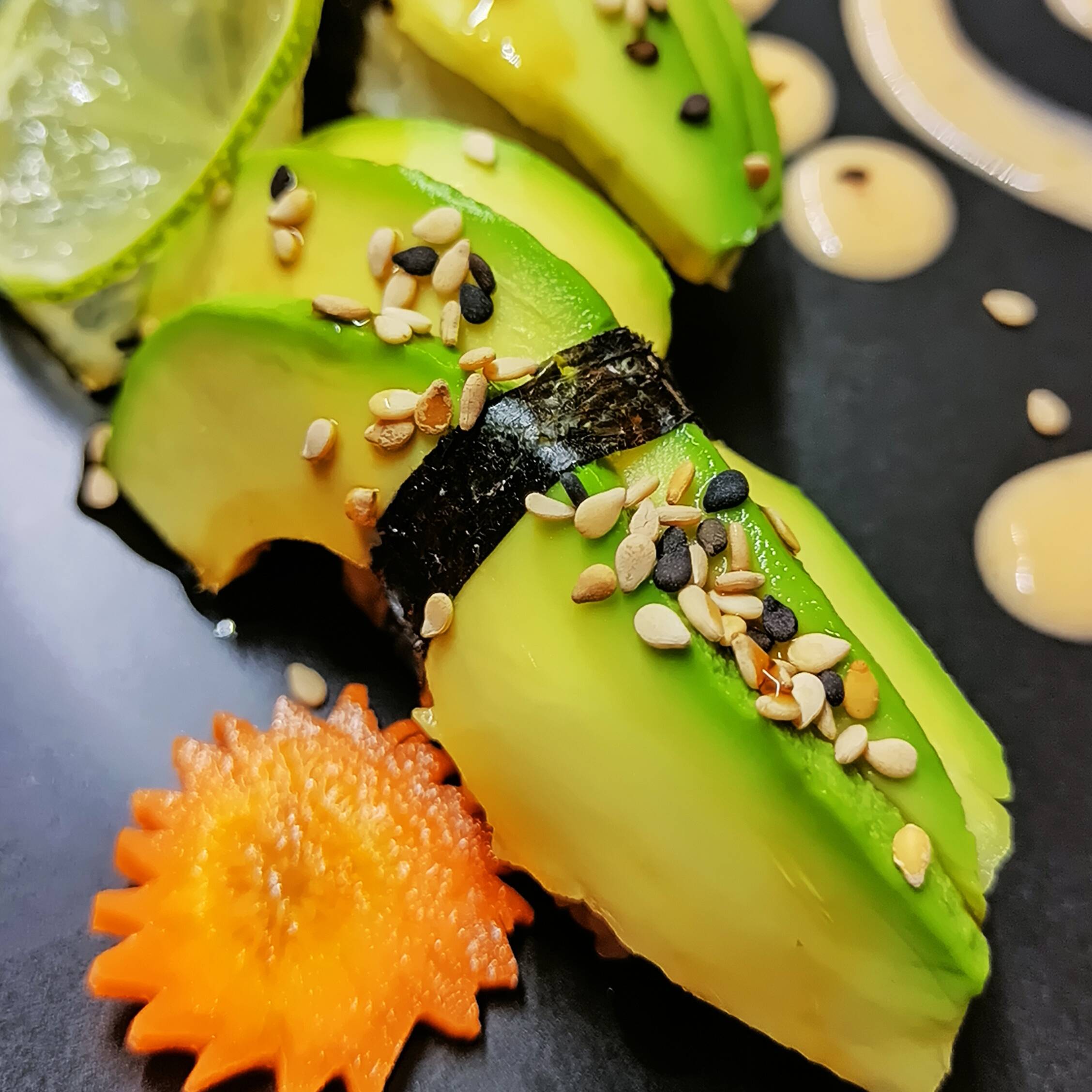 uramaki relleno de aguacate, tampico, pepino, cubierto de ajonjolí tostado y salsa teriyaki.