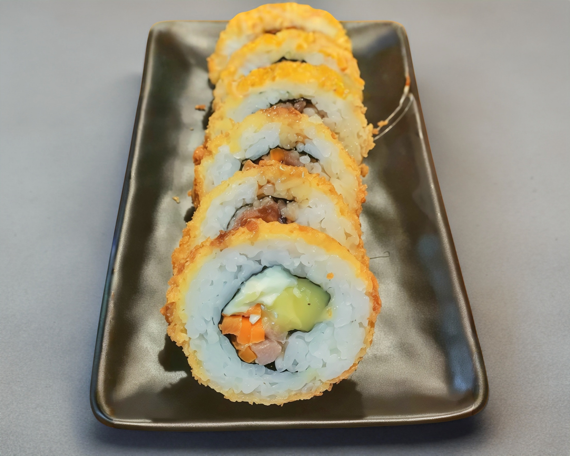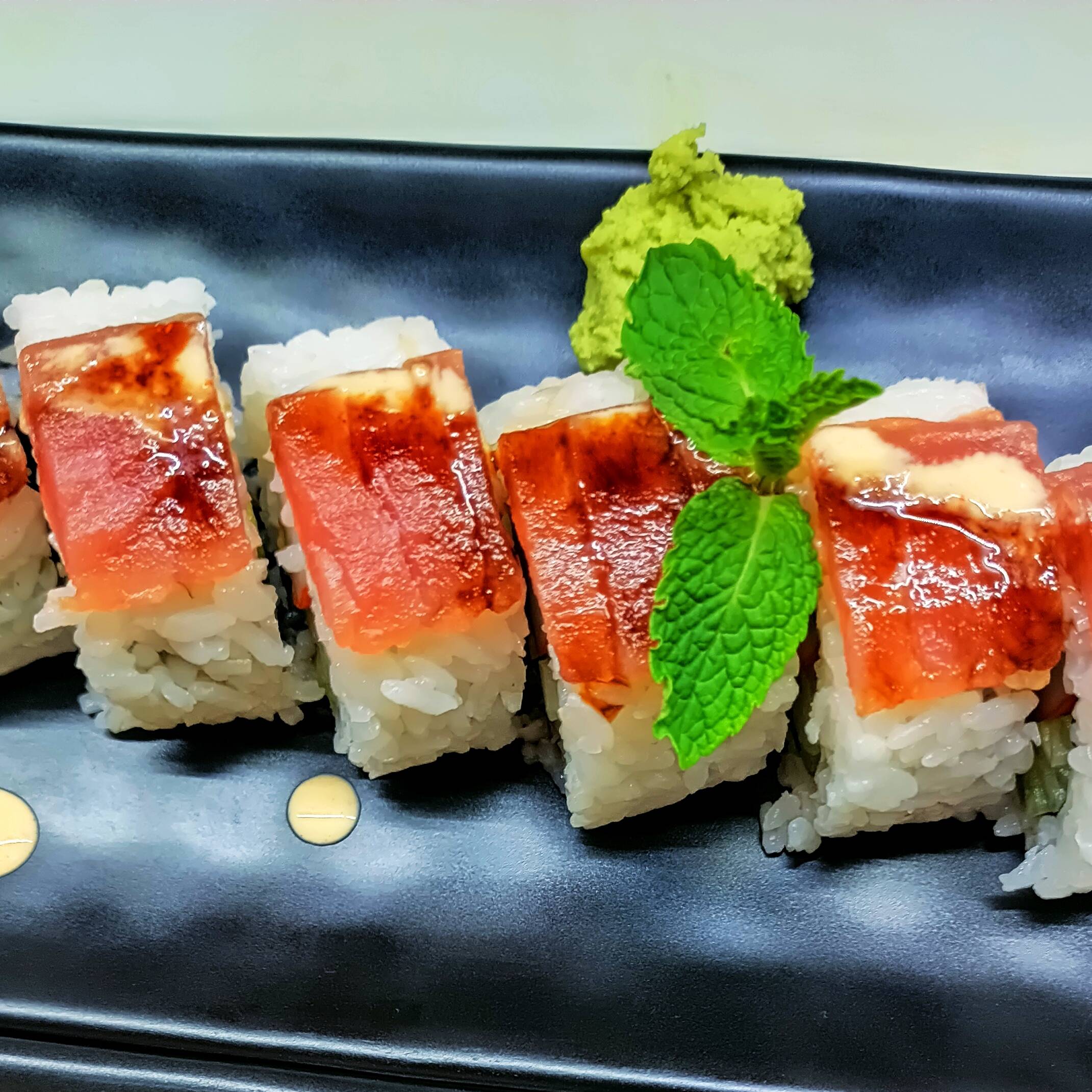 uramaki relleno de kanikama, pepino, aguacate. encima atún flameado, salsa chipotle y picante de la casa.