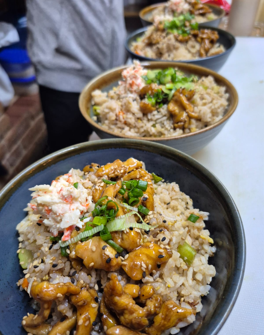 Arroz frito con huevo, condimentos de la casa, verduras picadas y pollo teriyaki. y chipotle