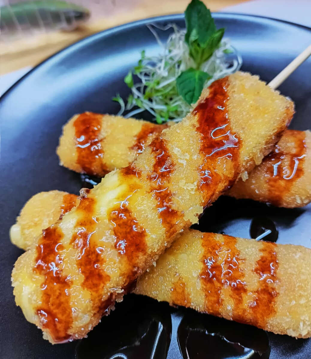 relleno de Atún fresco, queso crema, queso gouda y zanahoria salteada. Frito en tempura y panko con salsa teriyaki