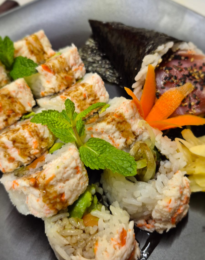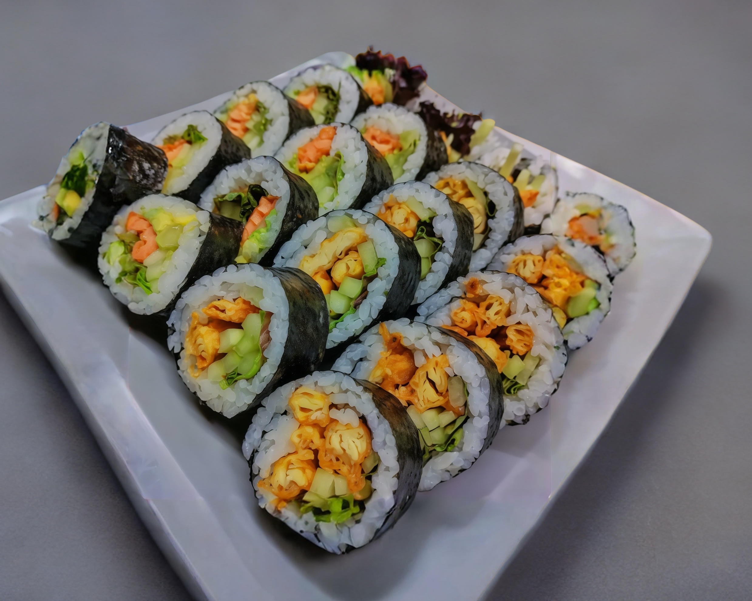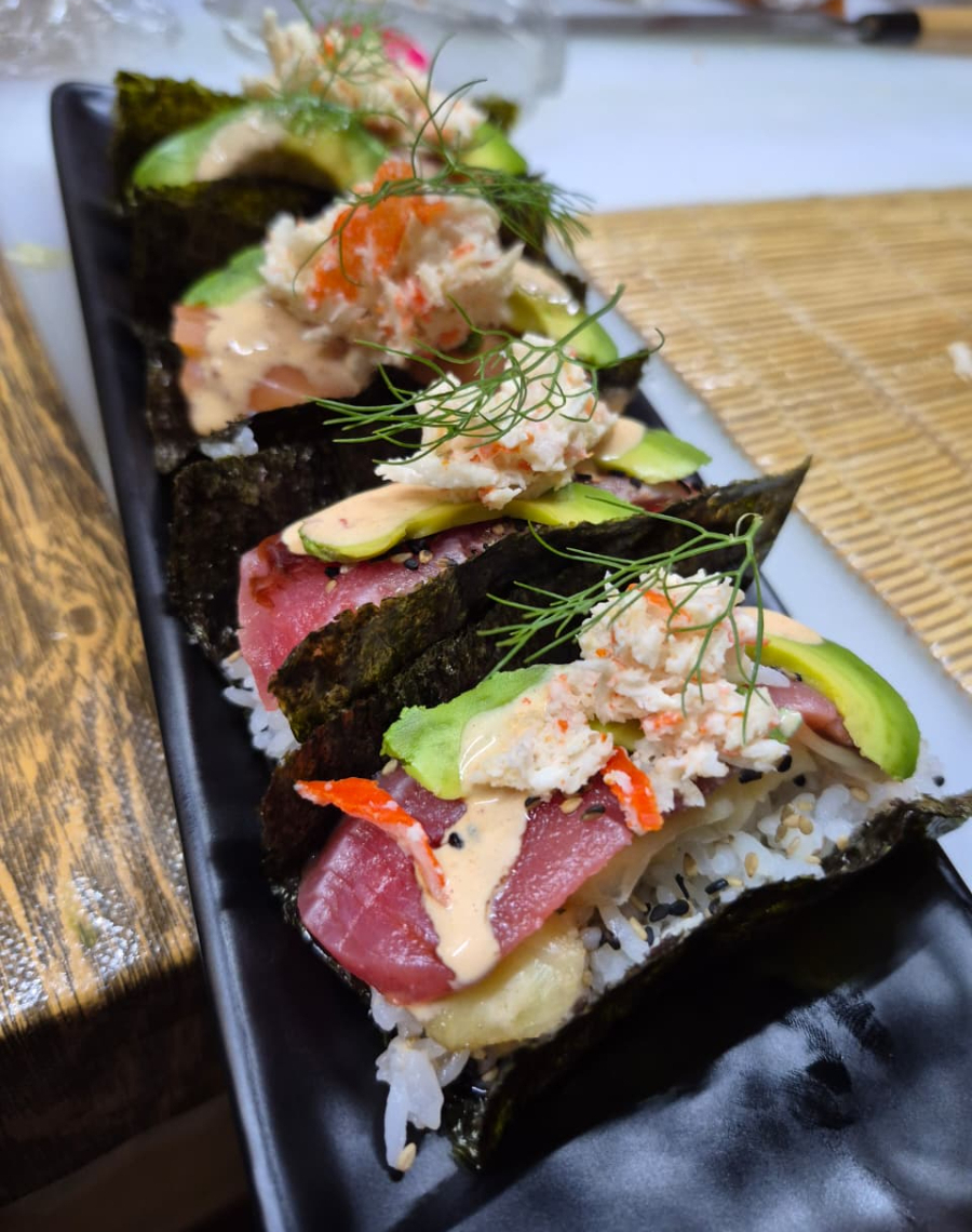 alga por fuera, relleno de Arrachera de res, zanahoria salteada, aguacate, lechuga. con salsa teriyaki encima