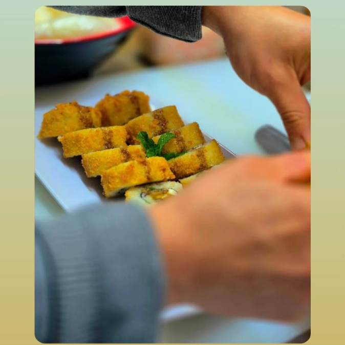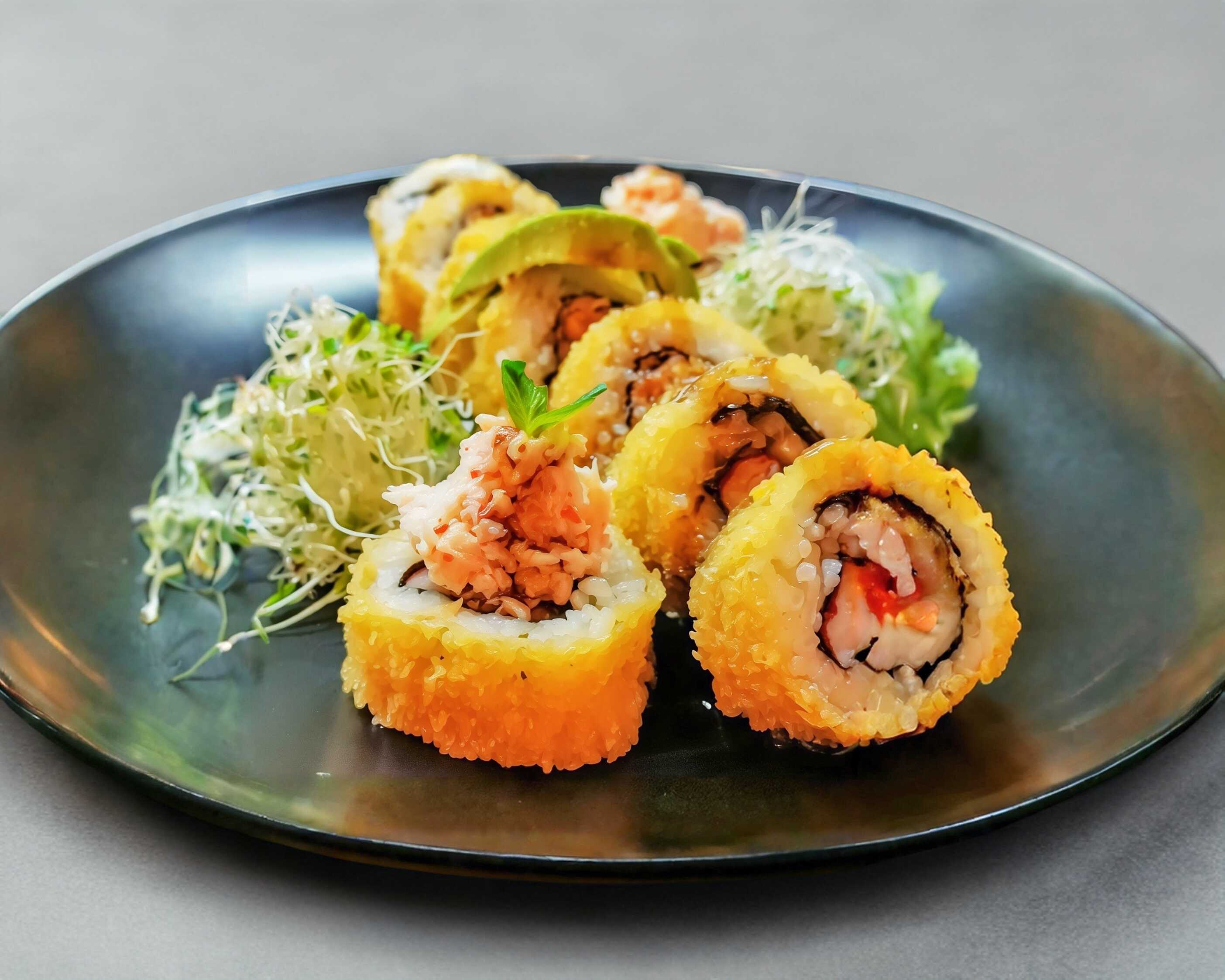 relleno de Arrachera de res, kanikama (surimi) y aguacate. Frito en tempura y panko con salsa teriyakii. acompañado de tampico