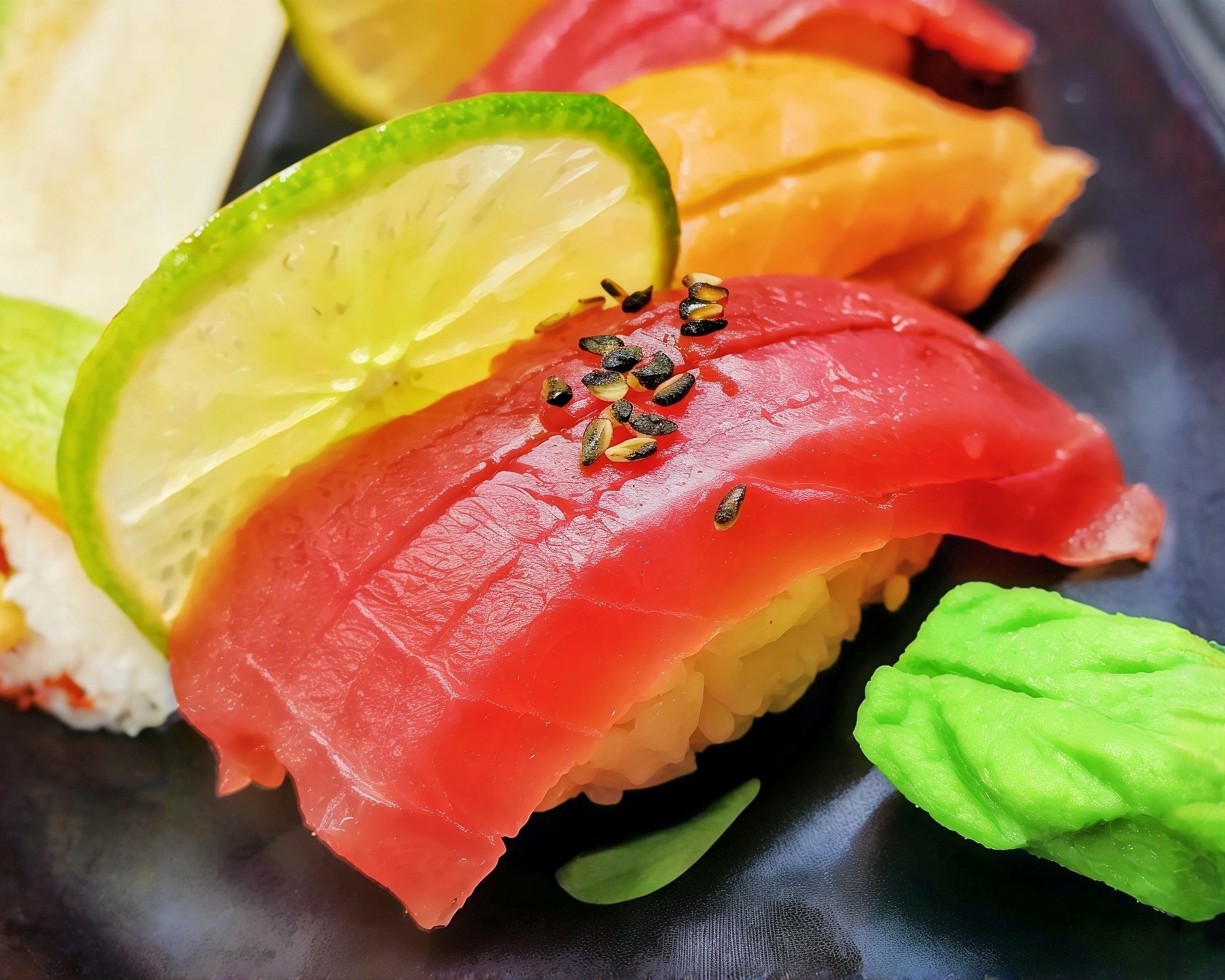Sushi en forma de cono relleno de pepino, aguacate y atún sellado