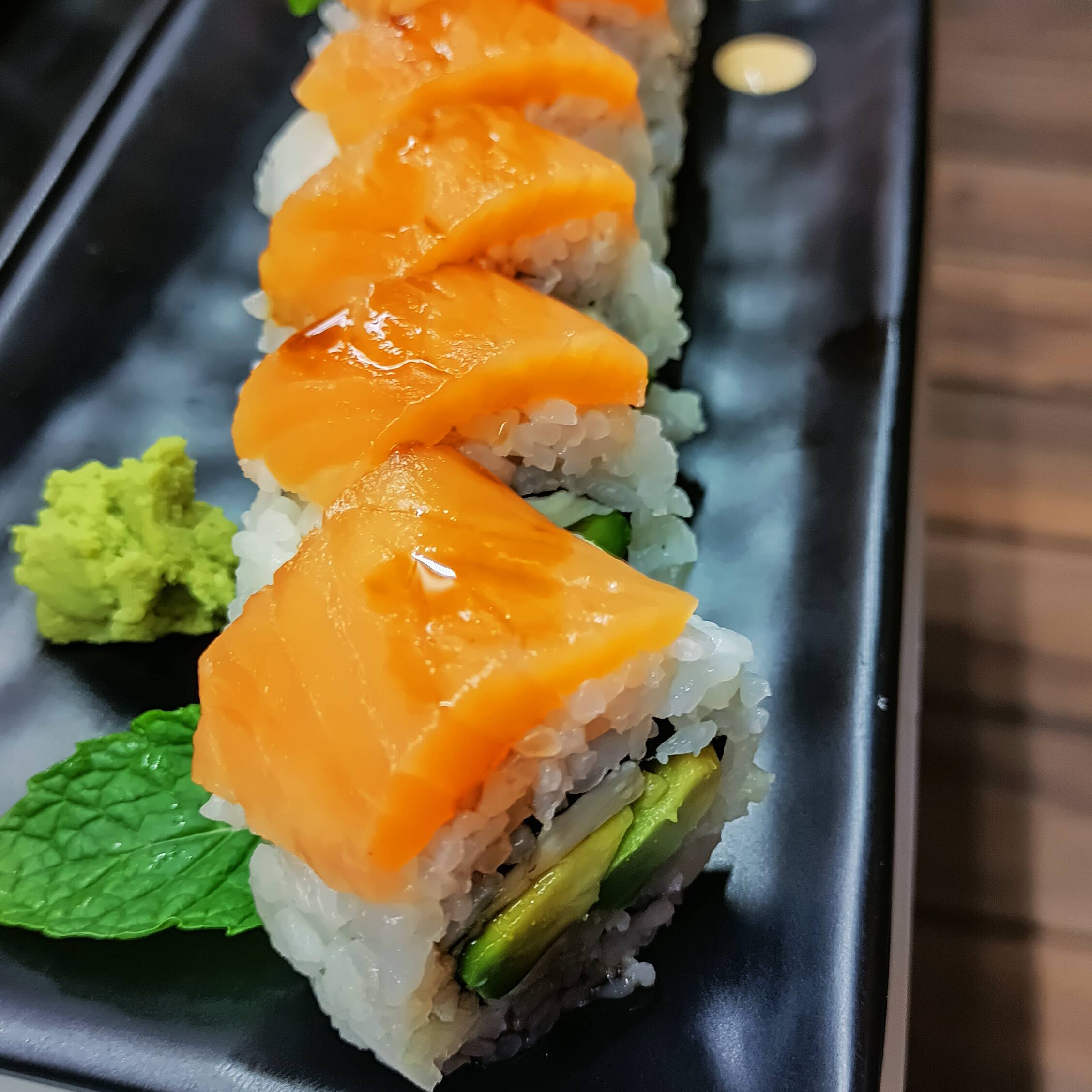 uramaki relleno de aguacate y queso crema, con una cubierta de salmón fresco, acompañado de wasabi y jengibre