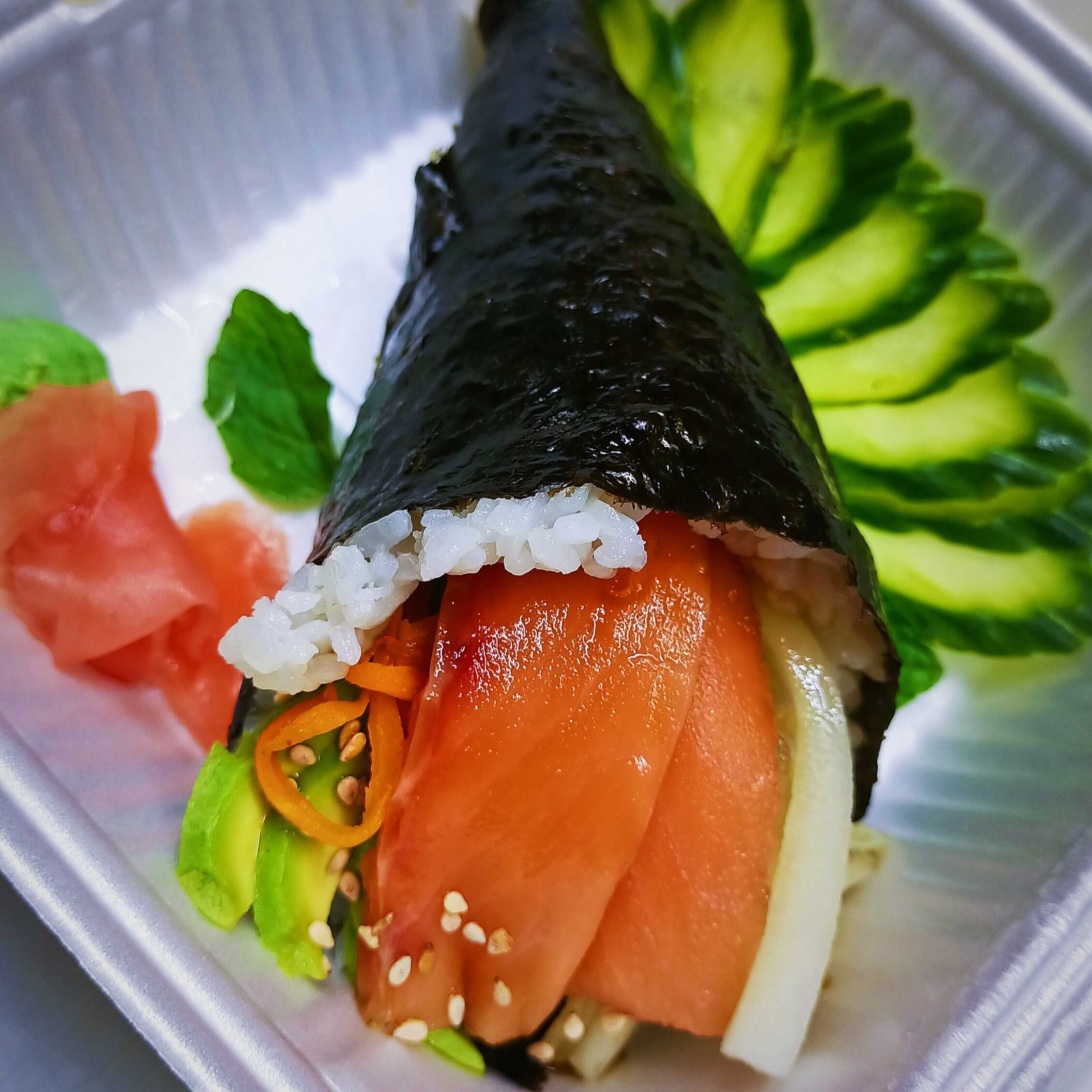 Sushi en forma de cono relleno de arroz, pepino, aguacate y salmón