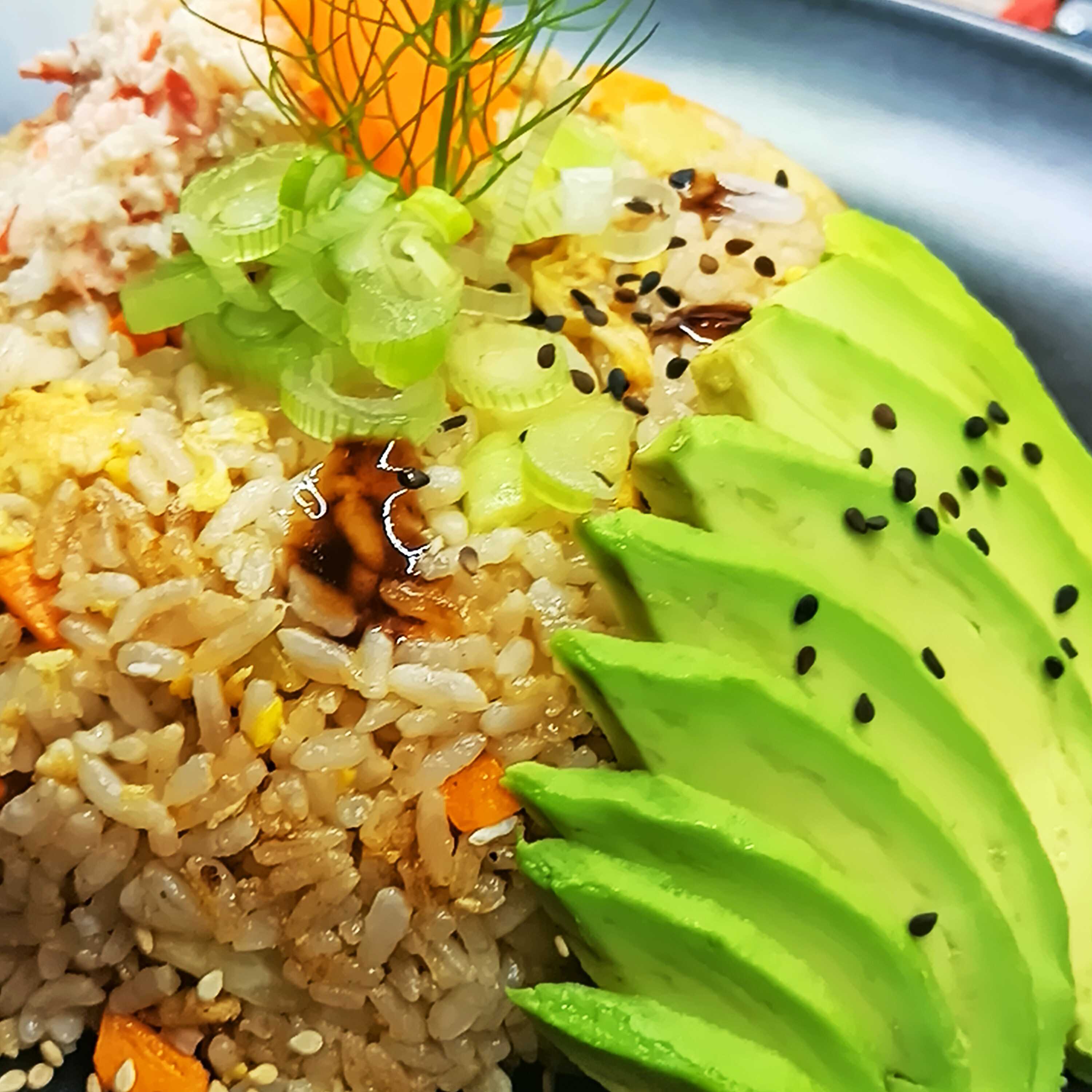 Arroz frito, cubitos de verduras, salsa de soya, condimentos de la casa, y aguacate y ajonjoli tostado.