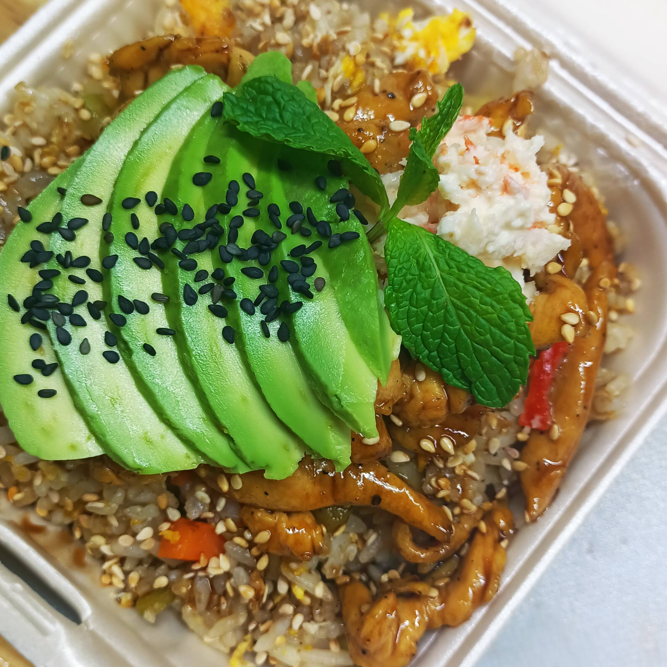 200 grs de arroz blanco con ajonjoli, pollo teriyaki y aguacate