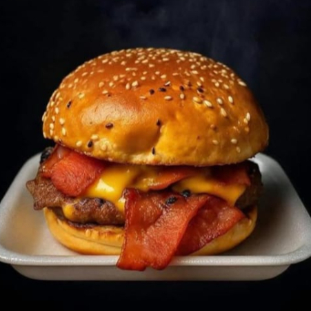 PAN ARTESANAL, CARNE DE RES, TOCINO, LECHUGA, TOMATE, QUESO AMARILLO, MAYONESA Y CATSUP
