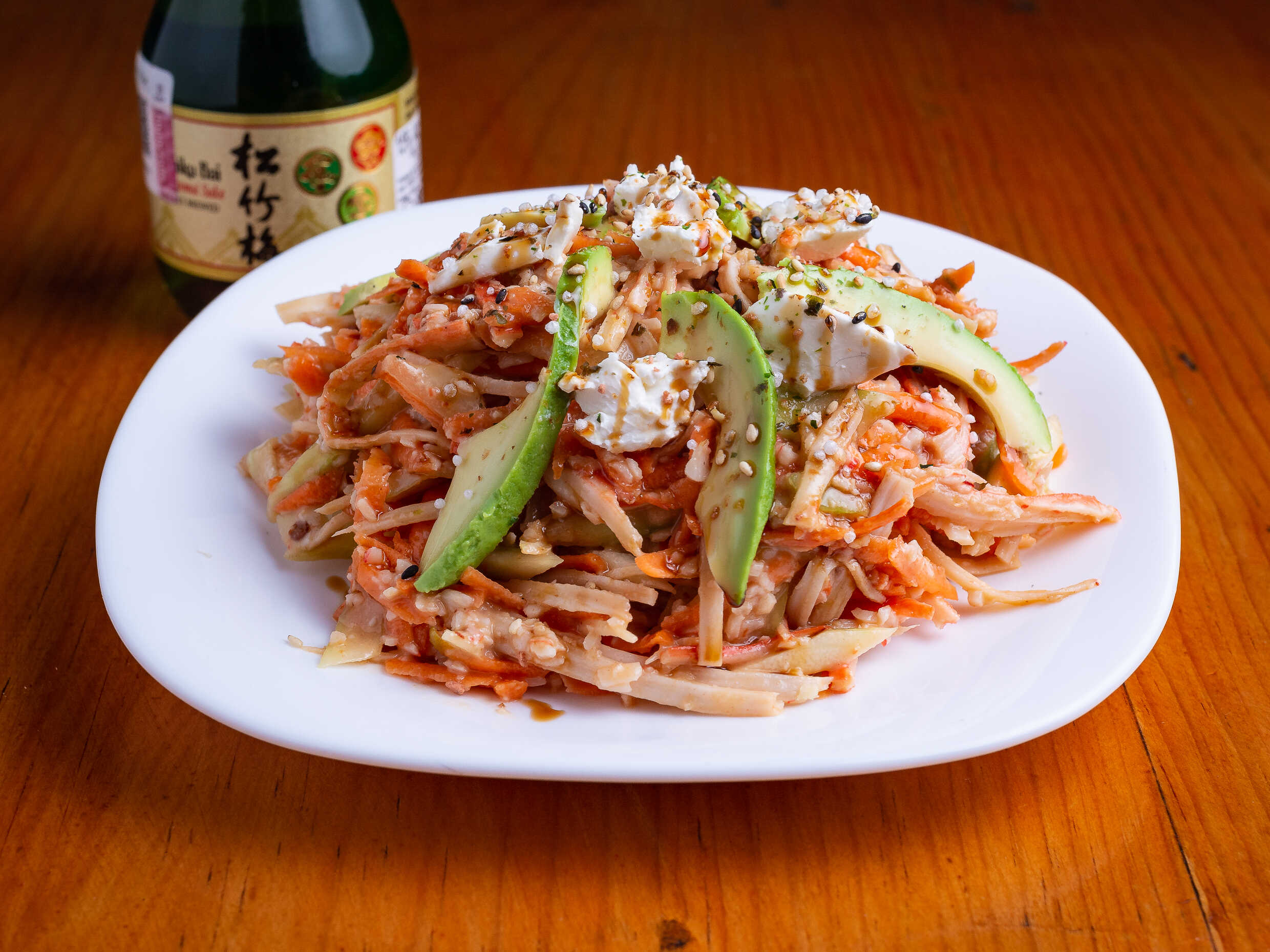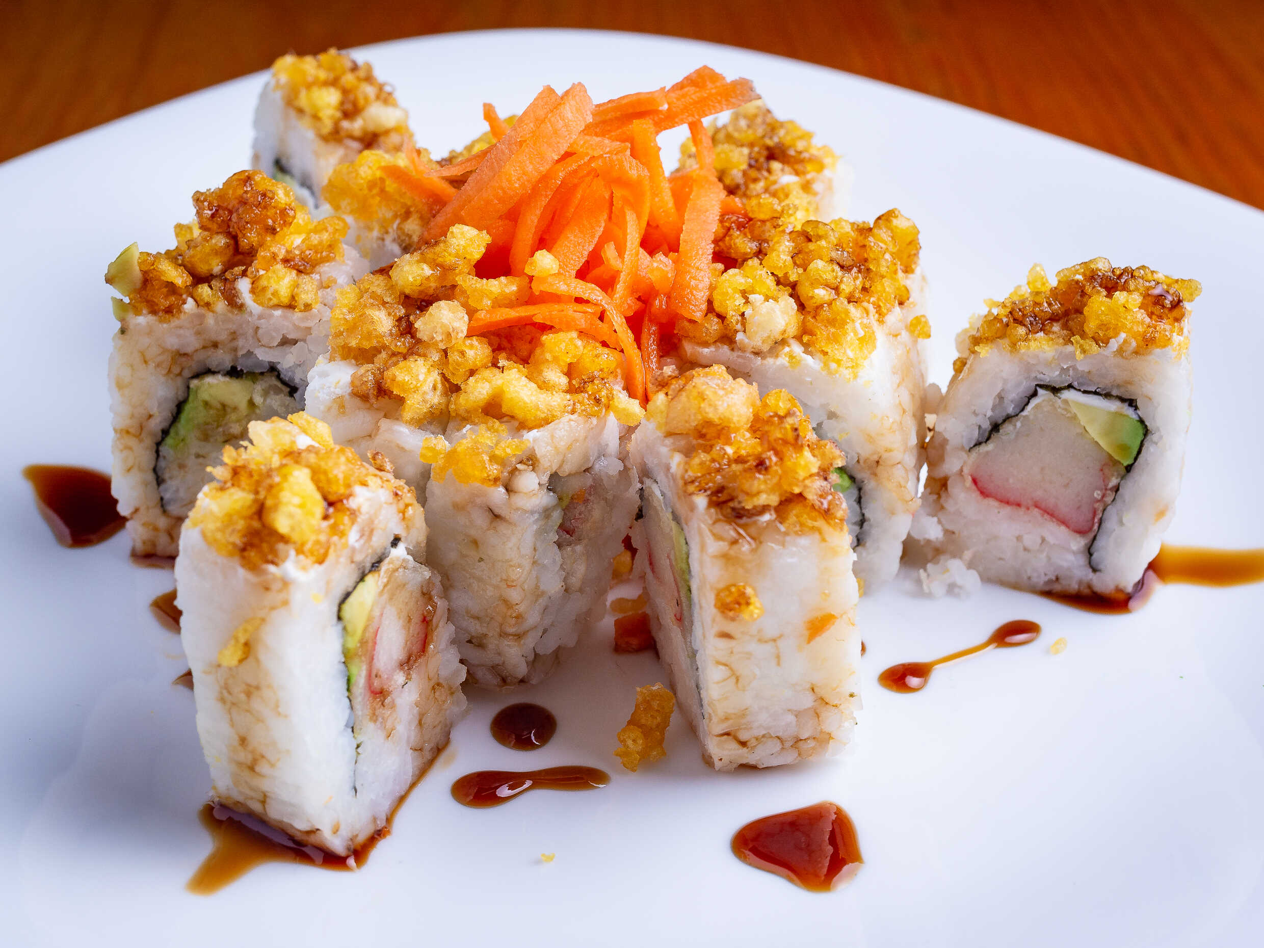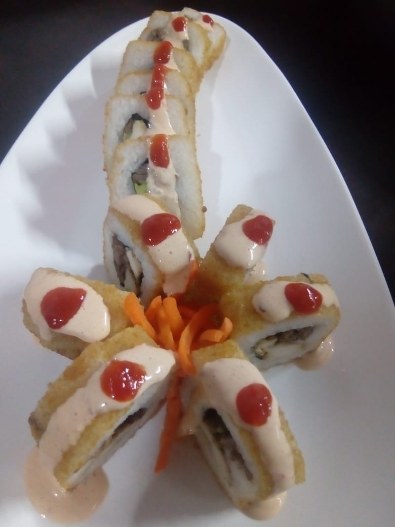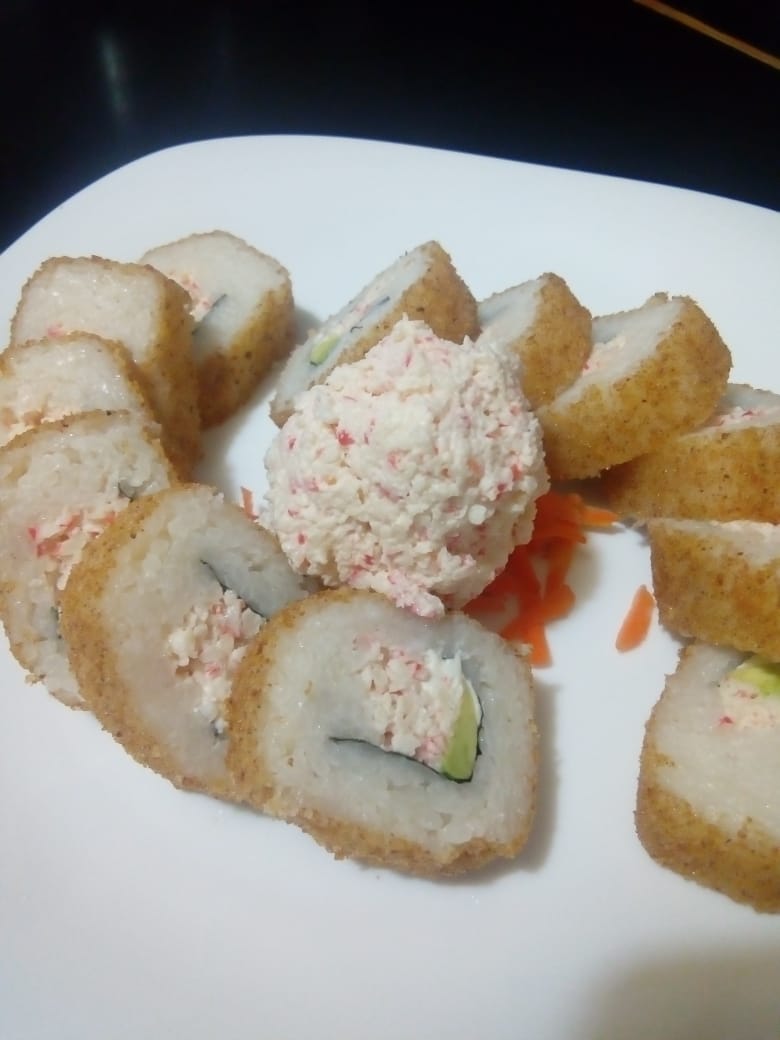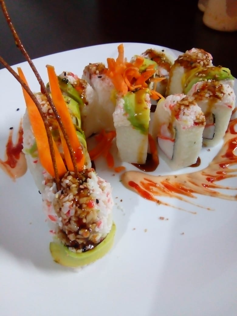 Zanahoria, surimi, pepino, tampico, bañada en salsa de anguila y aderezo, encima queso crema y aguacate.