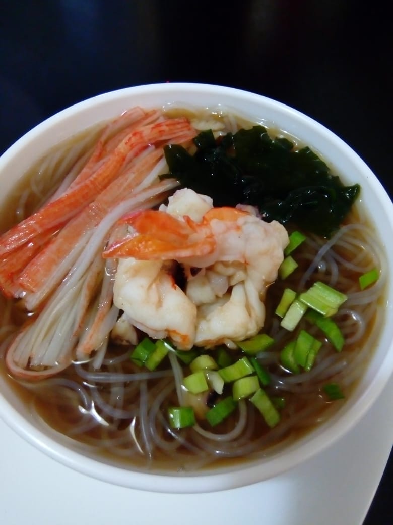 Estilo japonesa, de fideos transparente y mariscos.