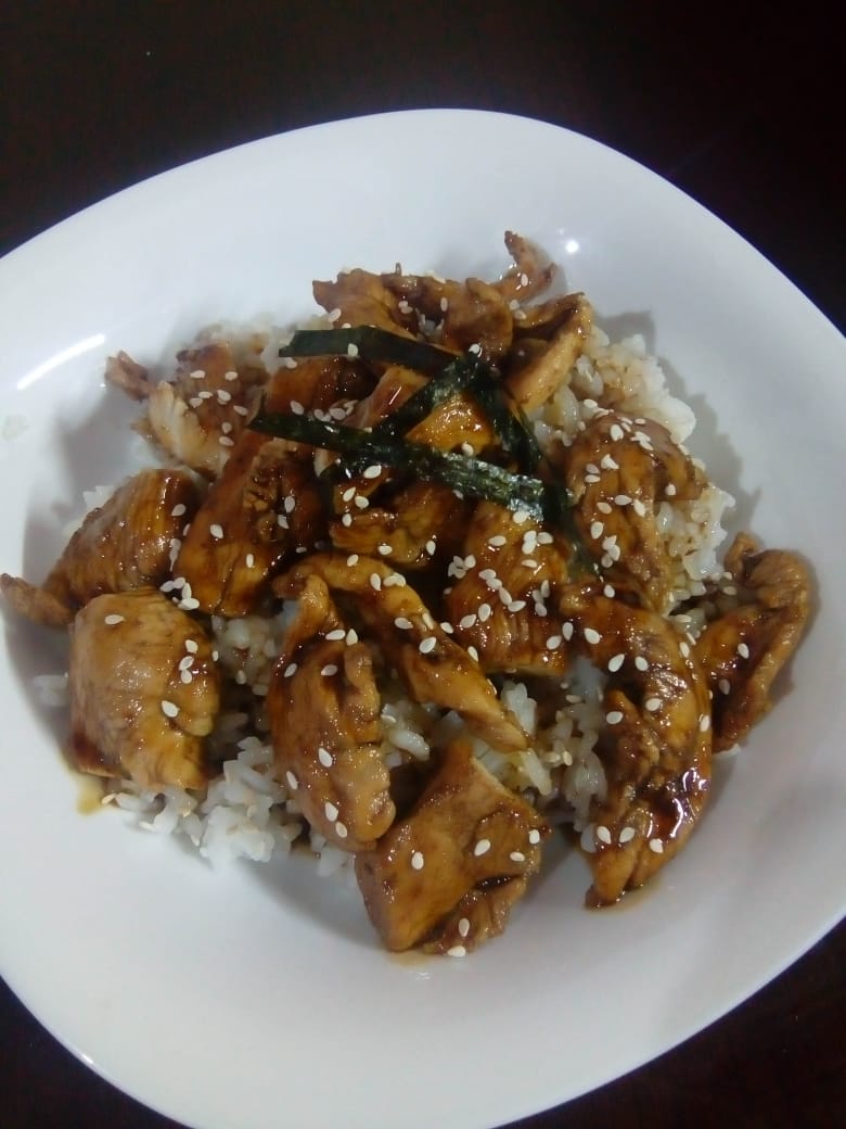 Pollo en salsa teriyaki, sobre una cama de arroz, ajonjolí y nori.