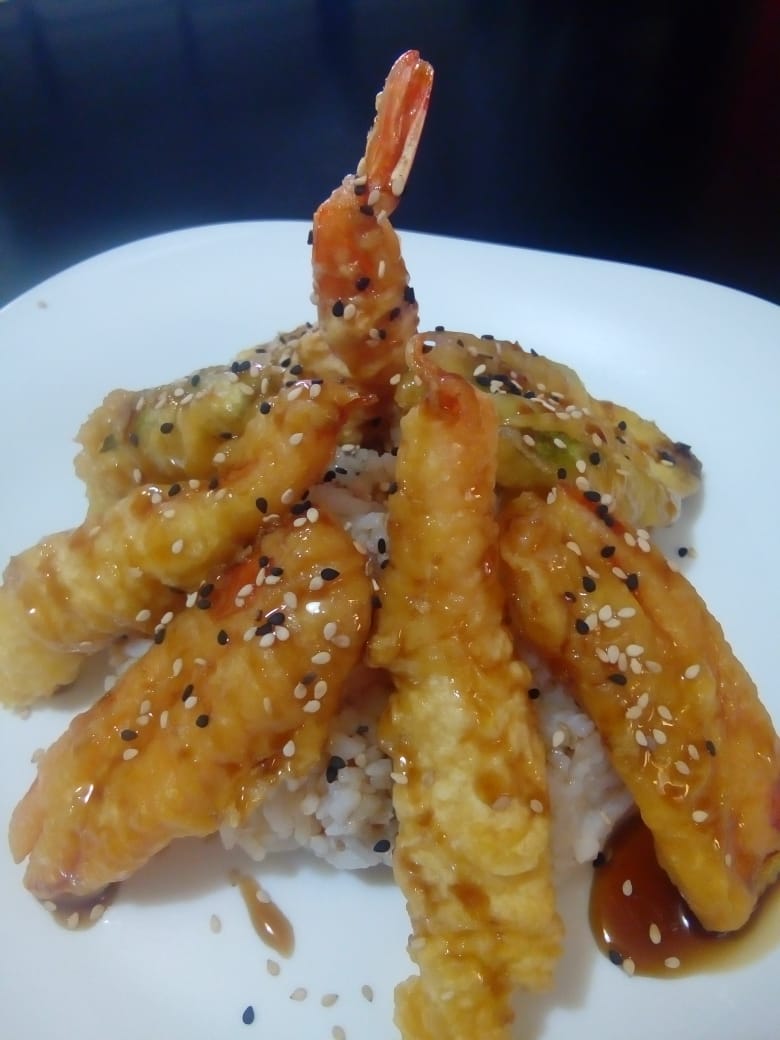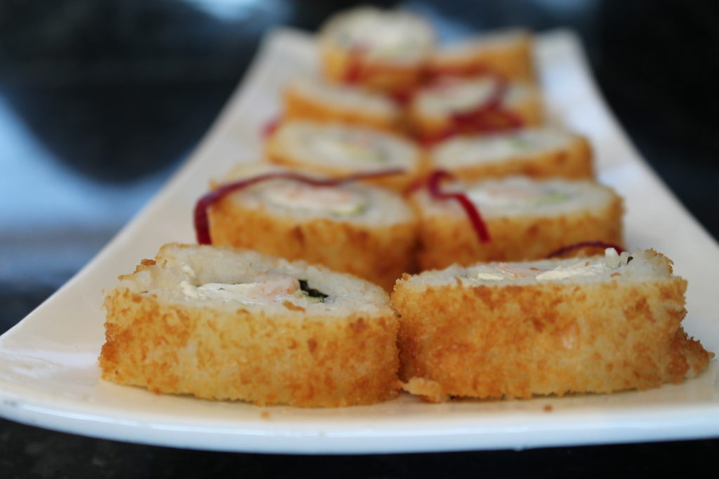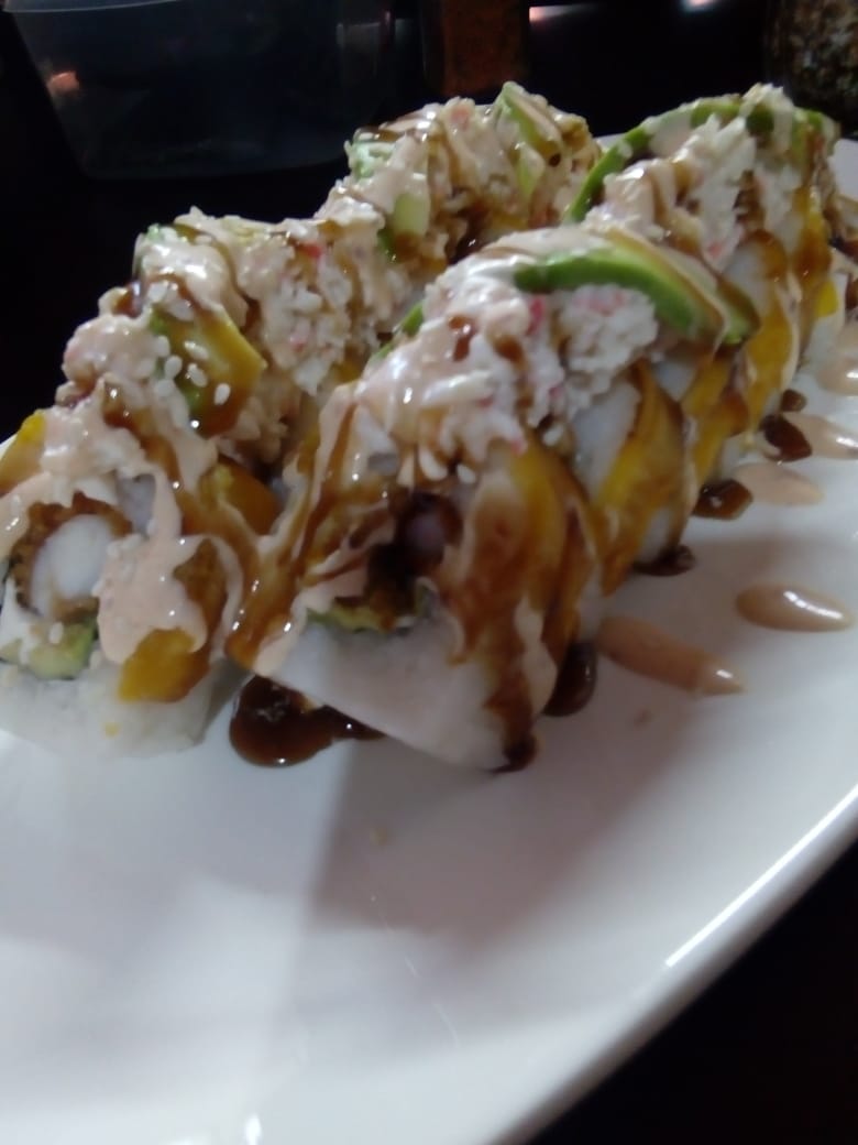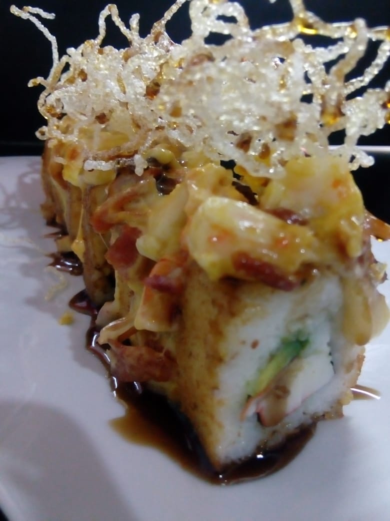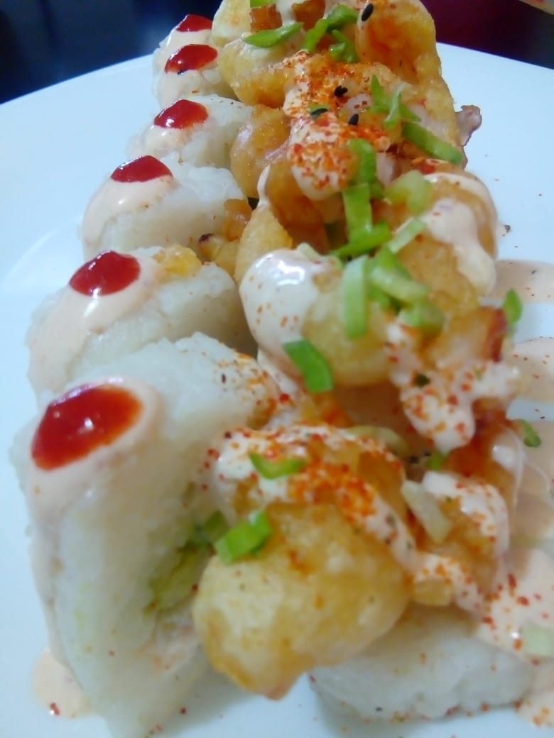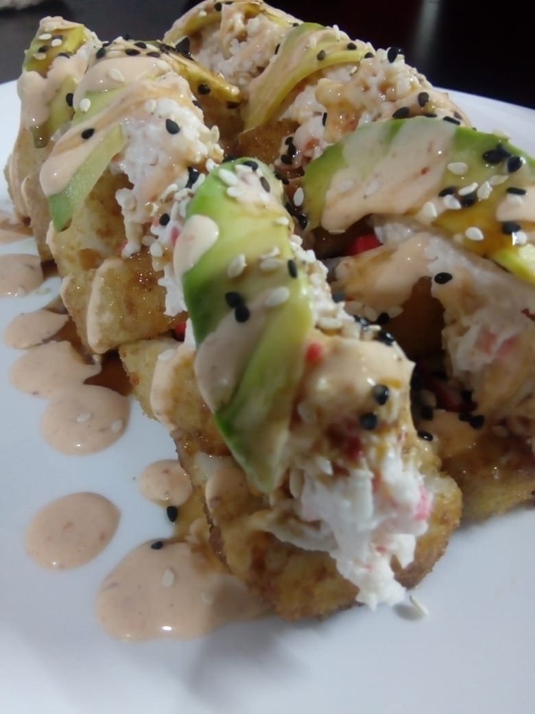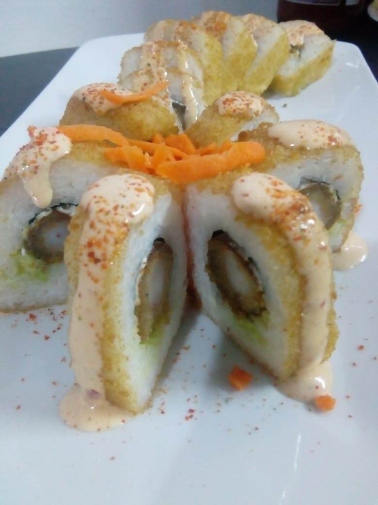 Queso crema, aguacate, tampico, mitad empanizado y mitad natural, encima camarón capeado bañado en aderezo, cebollín y togarashi.