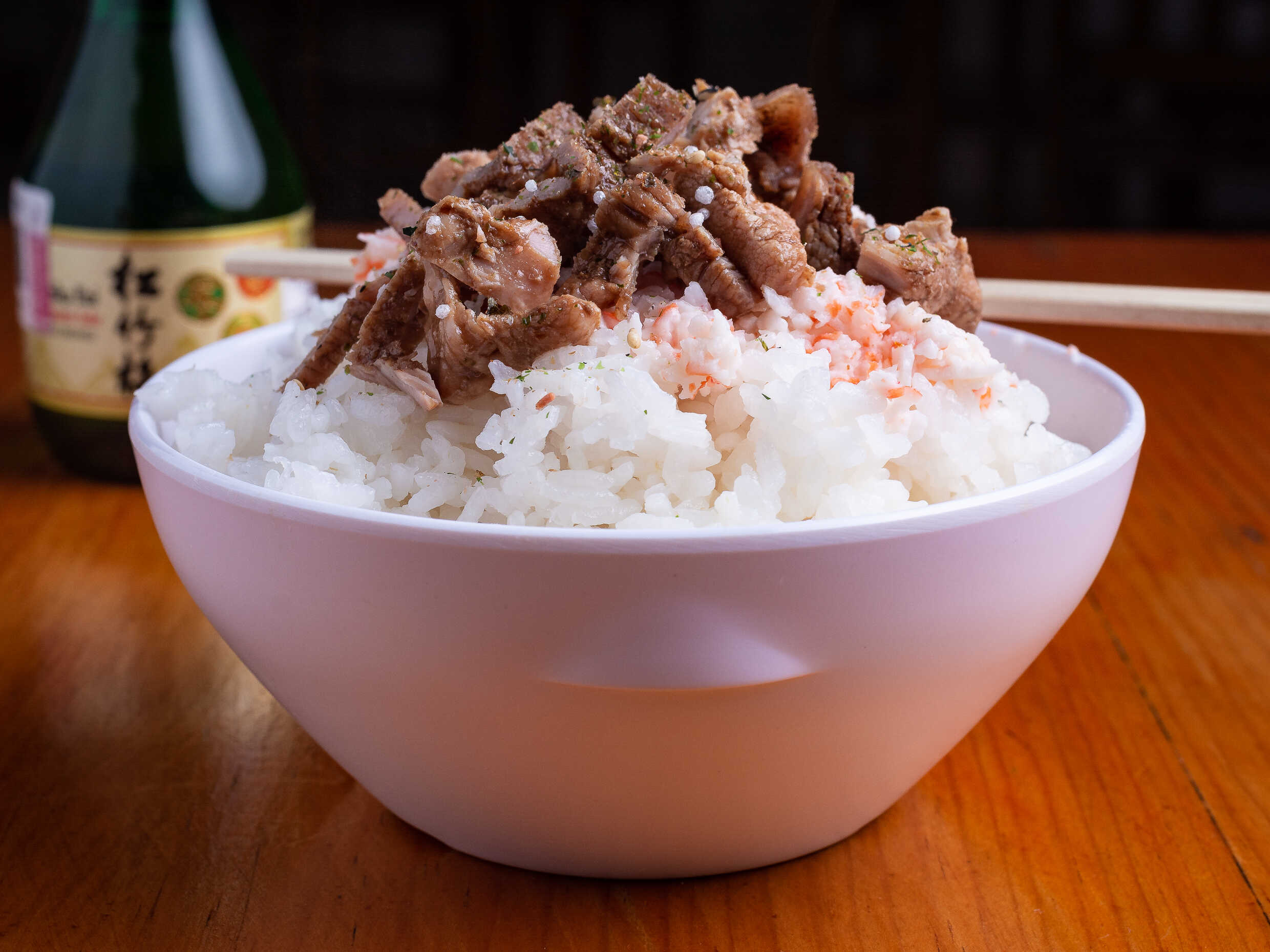 Arroz al vapor, encima pollo, res, tampico y furikake.