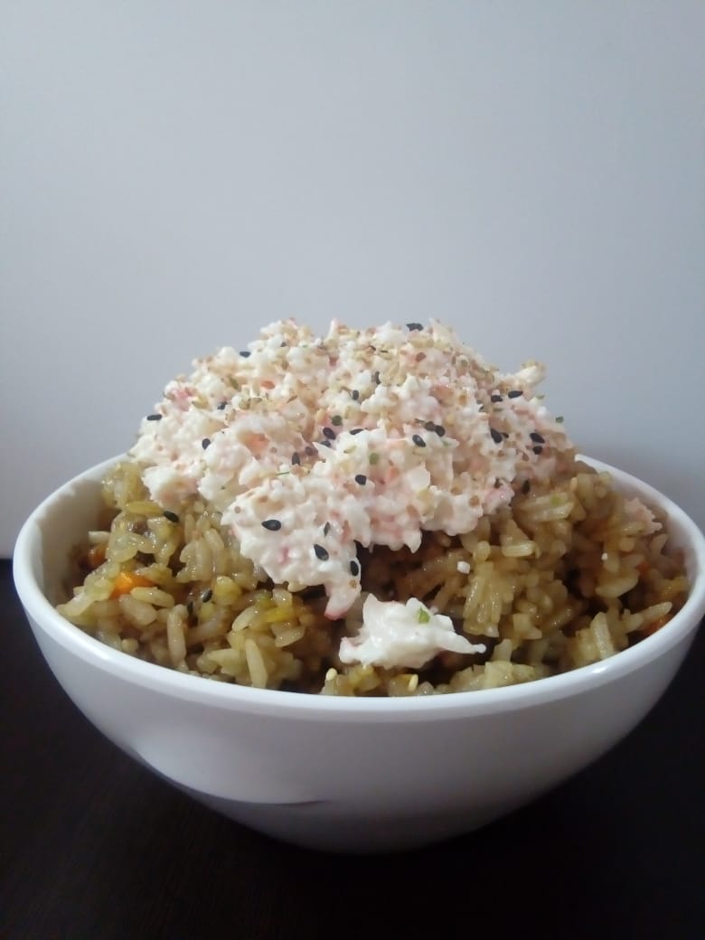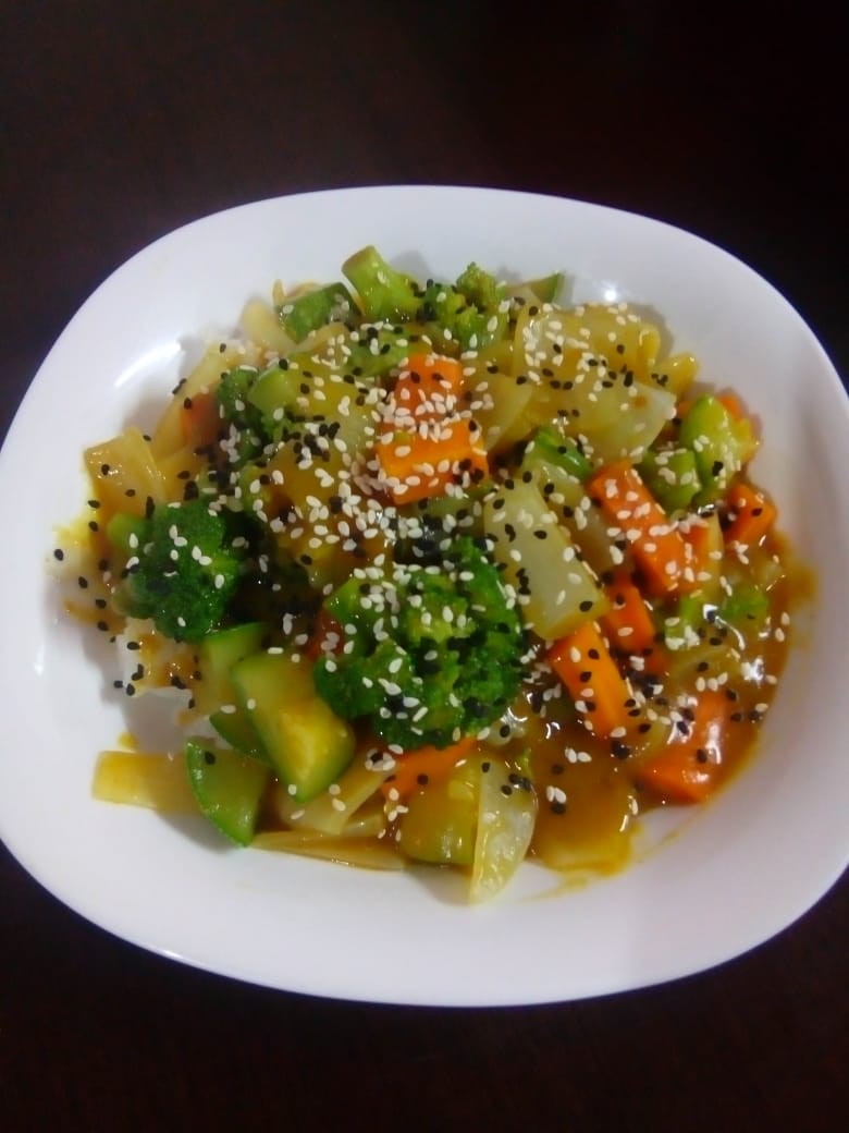 Cama de arroz, zanahoria, calabaza, cebolla y brócoli, bañada en salsa curry toque de ajonjolí.
