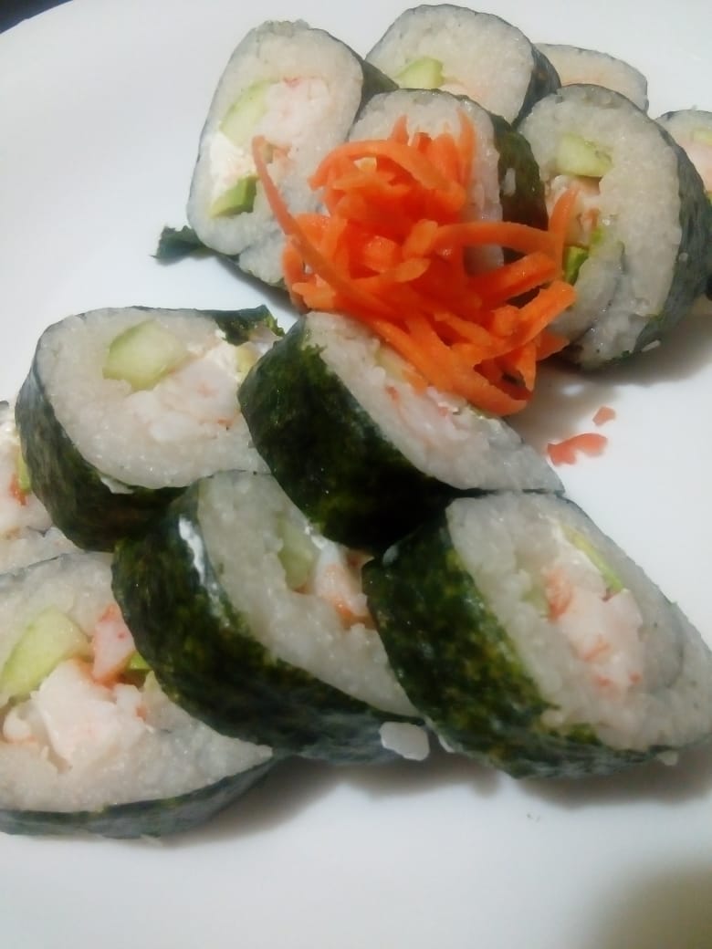 Aguacate, pepino y camarón, por fuera queso crema, tampico y furikake.