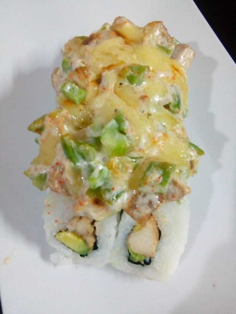 Aguacate, pollo, encima queso gratinado, bañado en salsa de anguila y aderezo.