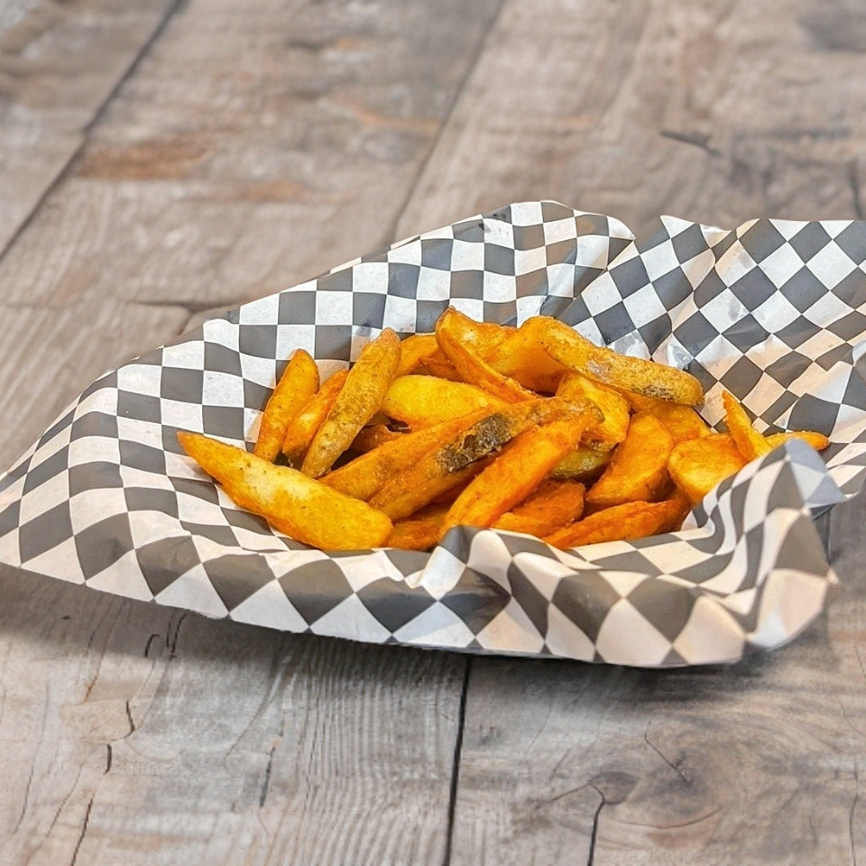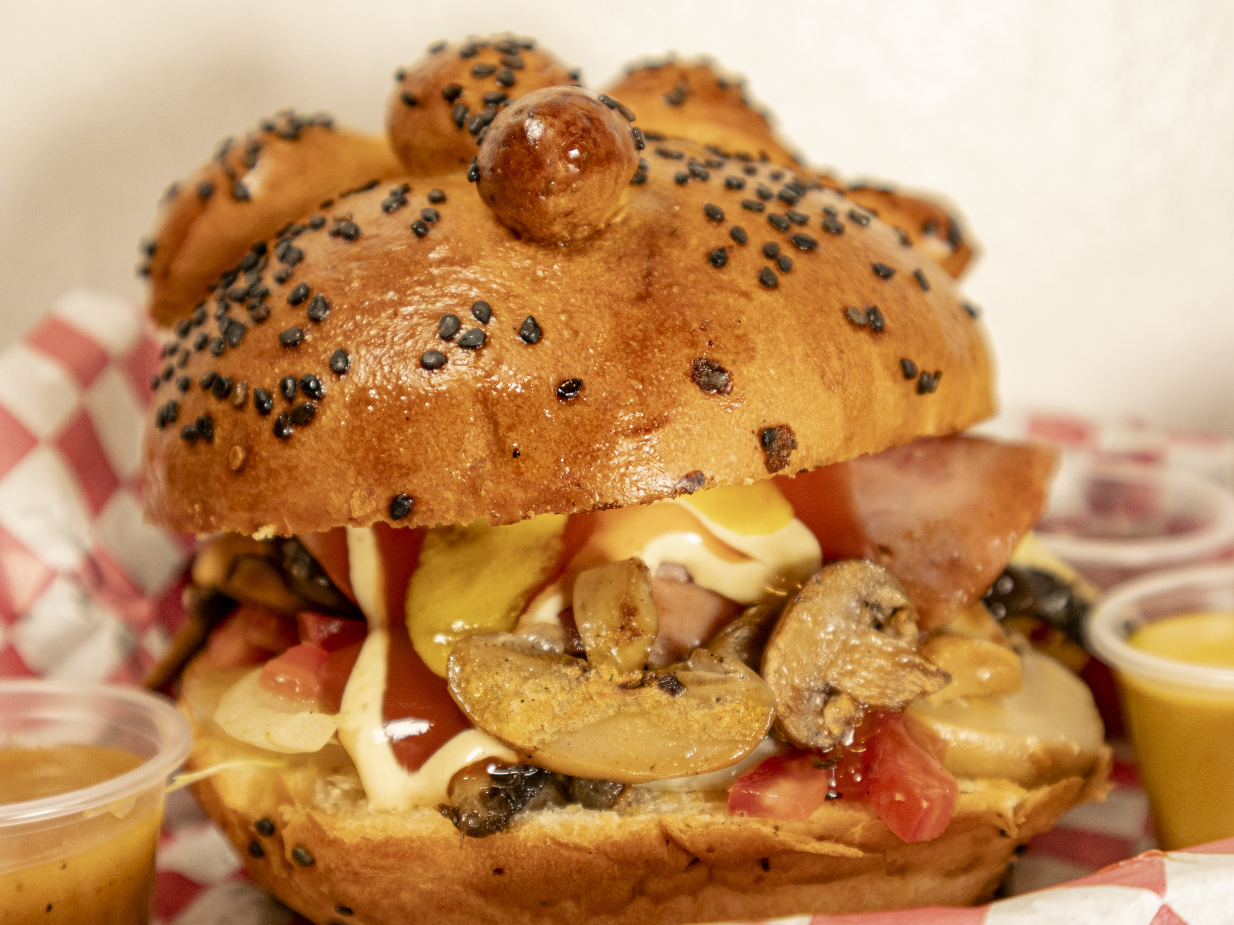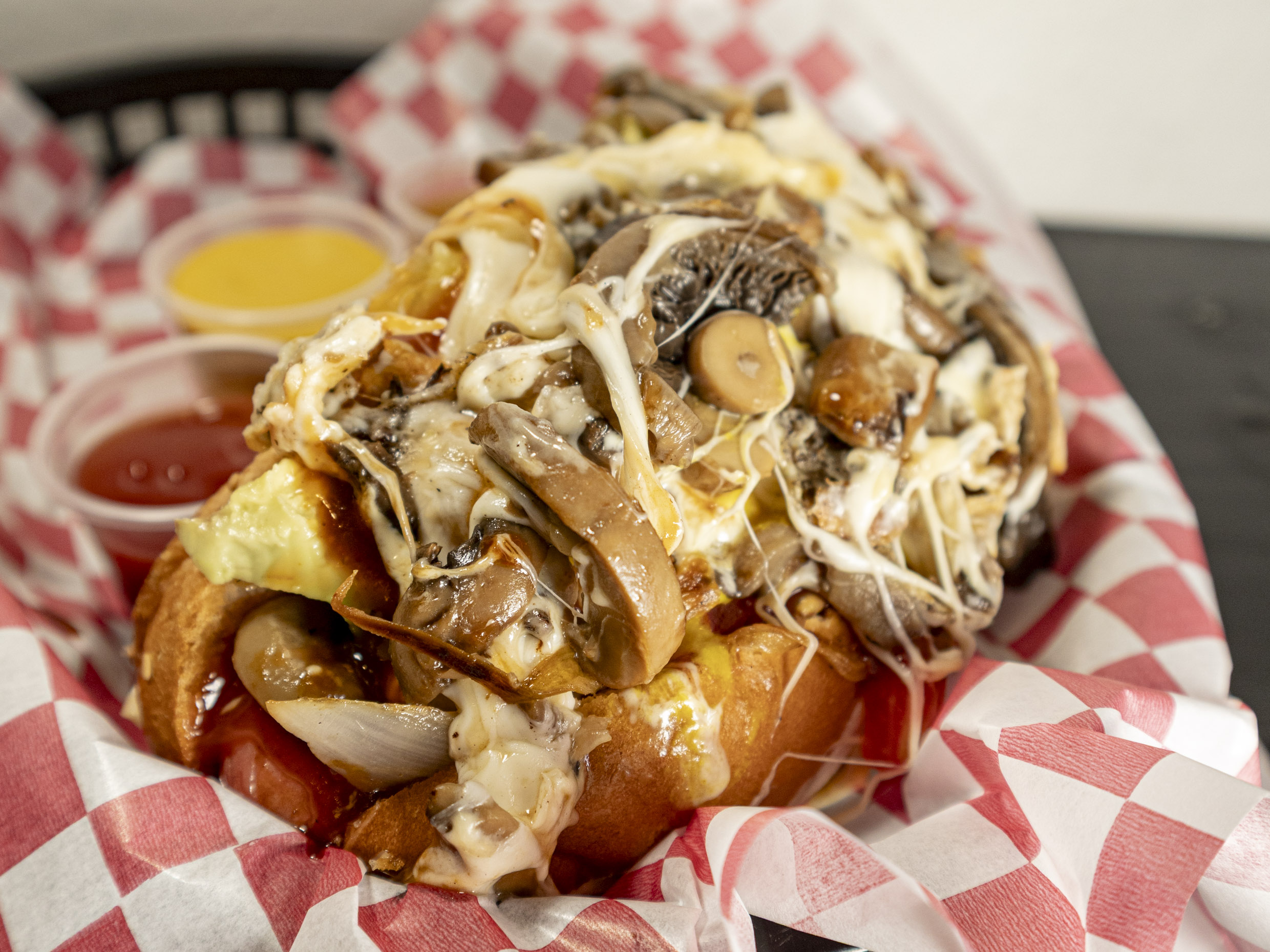 Salchicha frita, tocino, aderezos, cebolla frita, tomate, aguacate, piña y costra de queso manchego con champiñones.