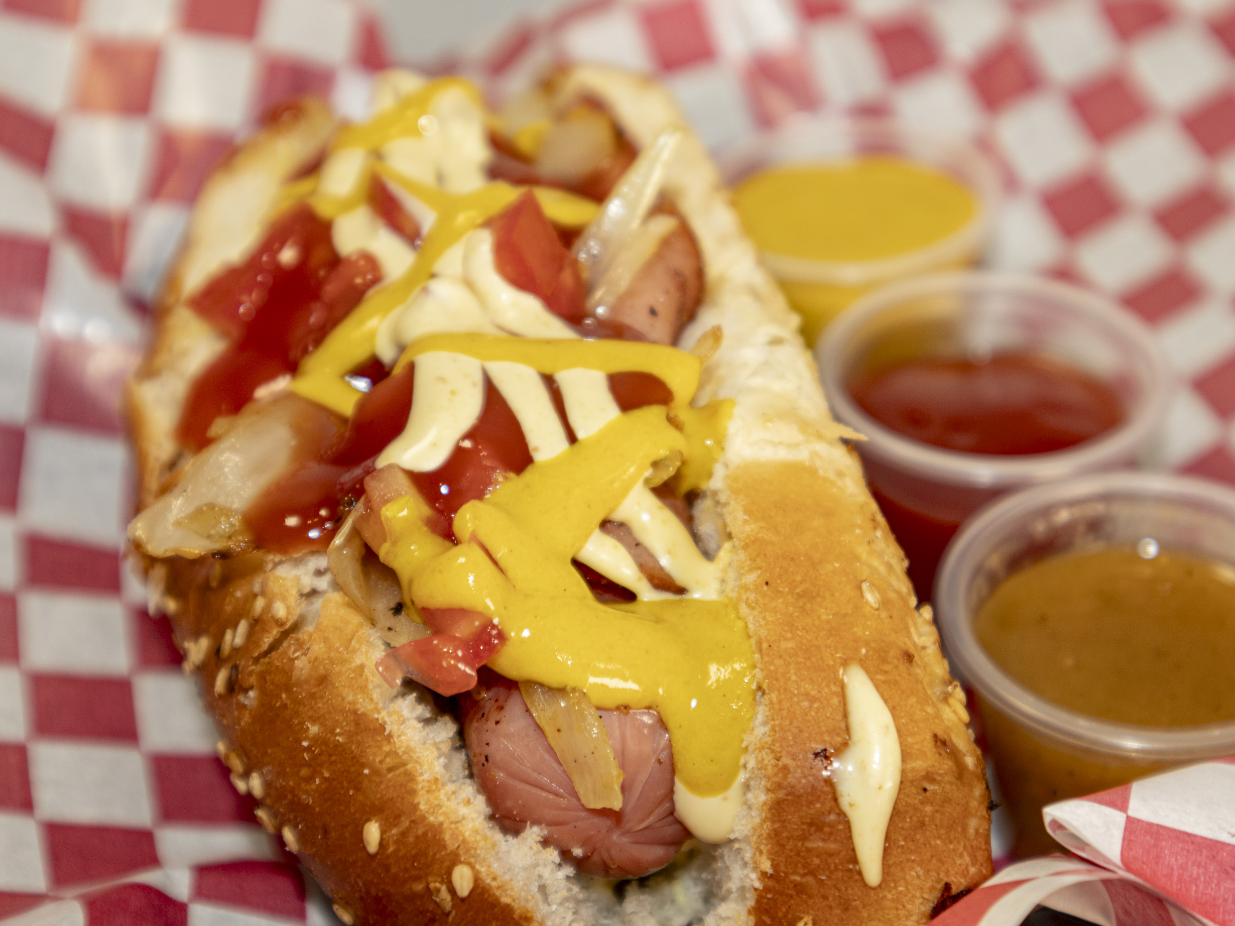 Salchicha frita, tocino, aderezos, cebolla frita y tomate.