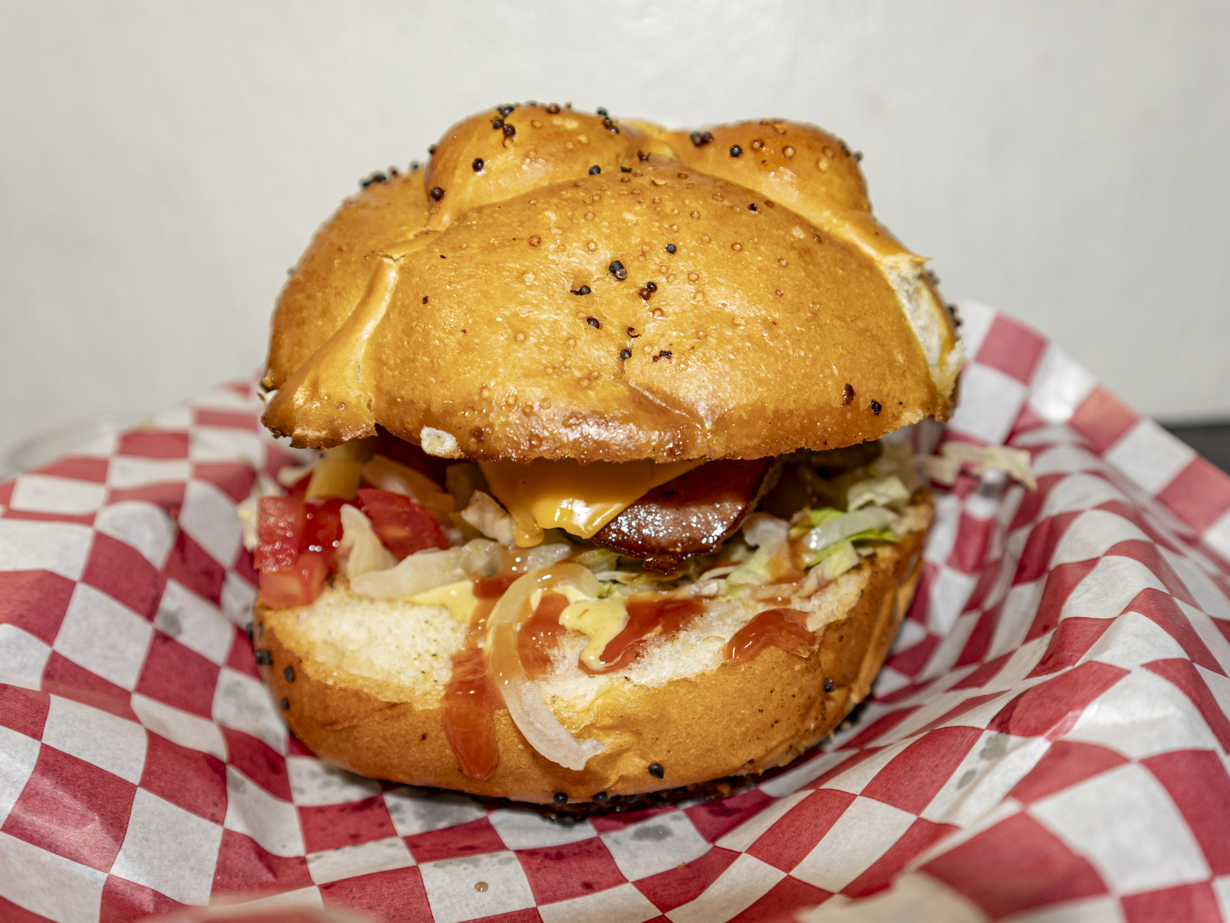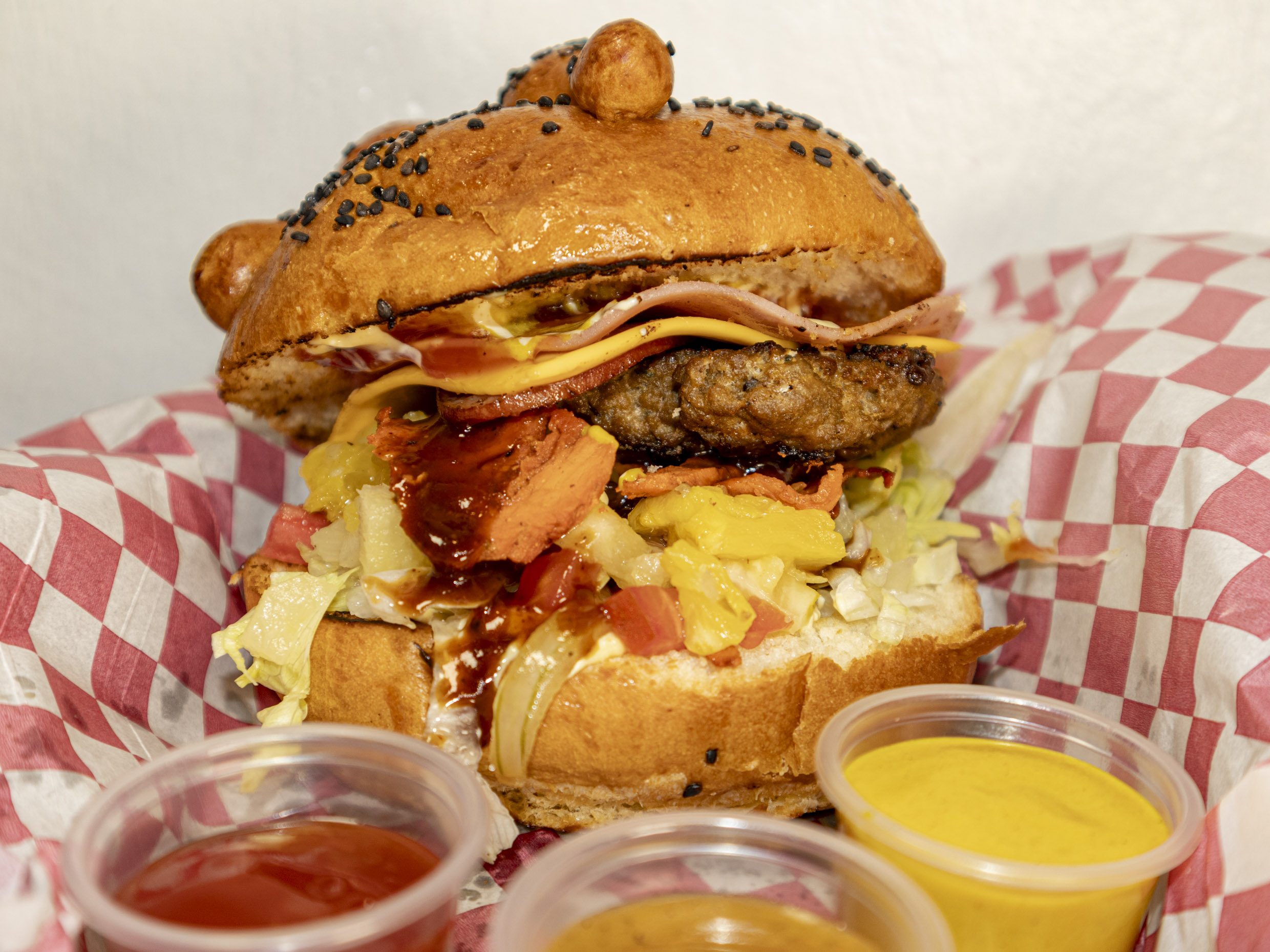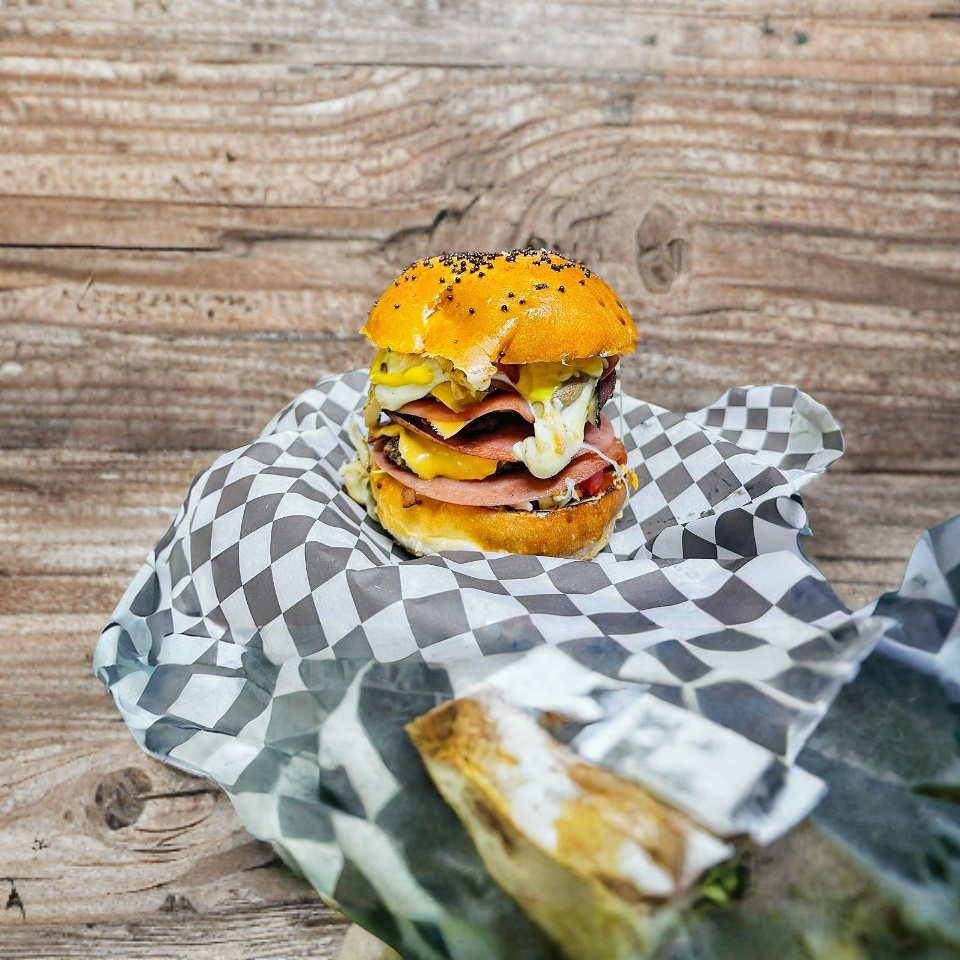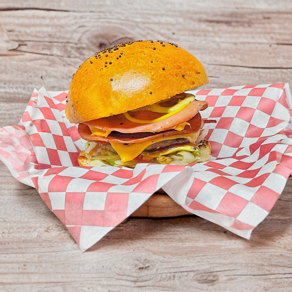 3 deliciosas carnes de la casa, aderezos, jamón, queso amarillo, tocino, lechuga, cebolla frita, tomate y aguacate.