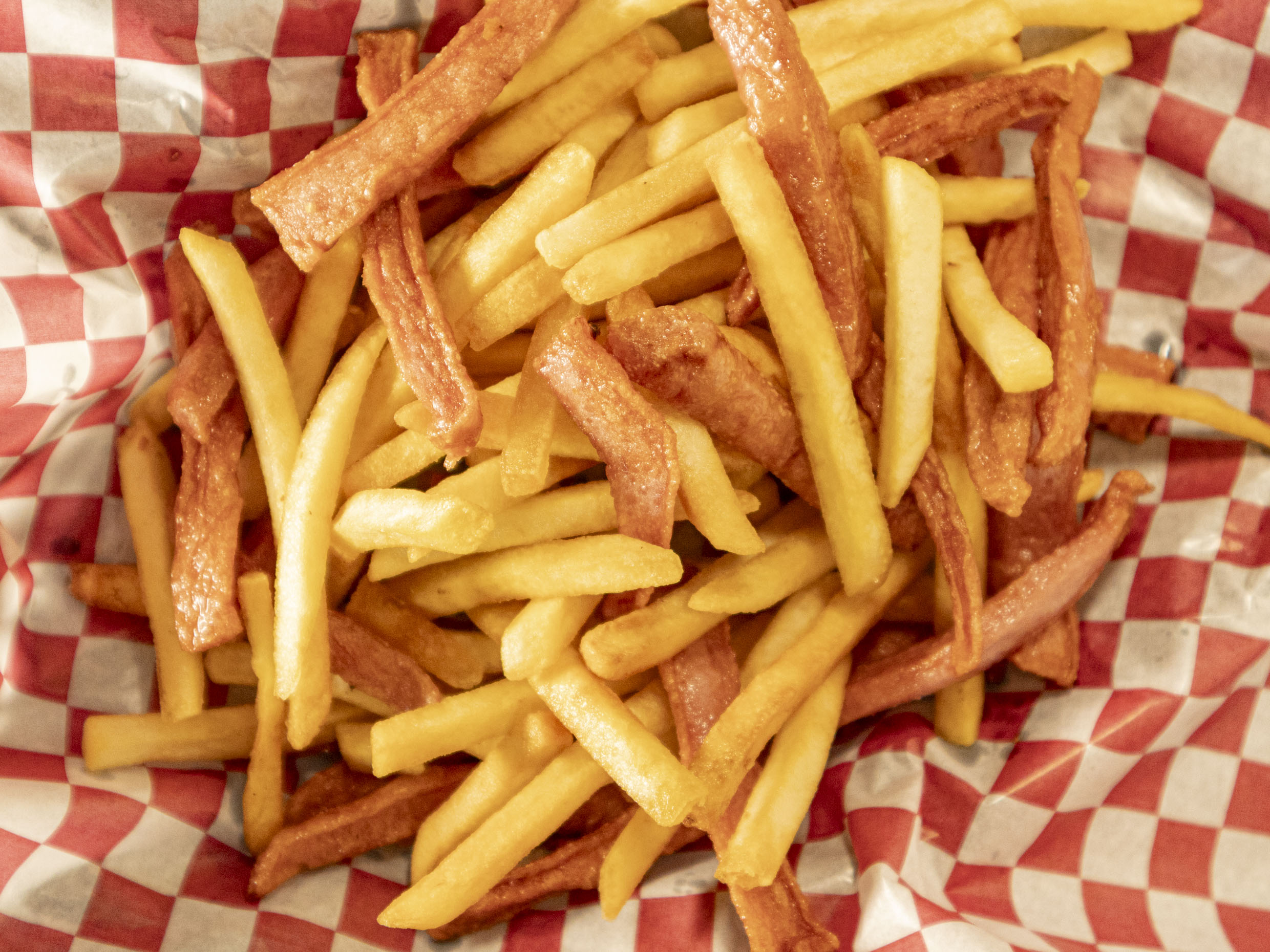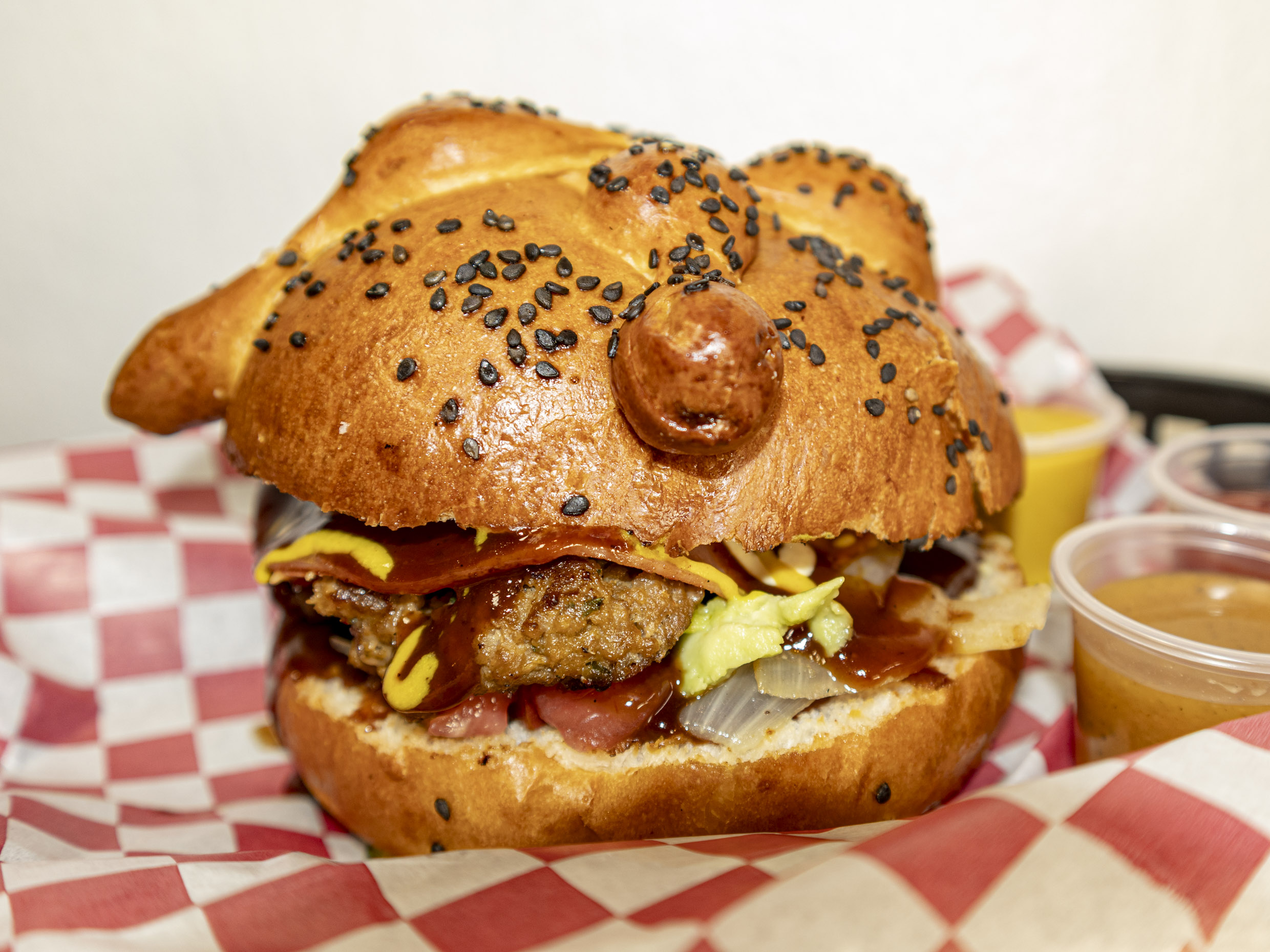 Salchicha frita, tocino, aderezos, cebolla frita, tomate, aguacate, piña y costra de queso manchego.