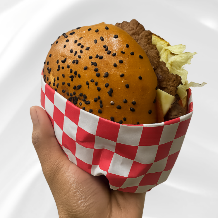 Pan Brioche,Carne de Res, Aderezos, Vegetales, Queso Amarillo, Jamón, Tocino y Salsa BBQ.