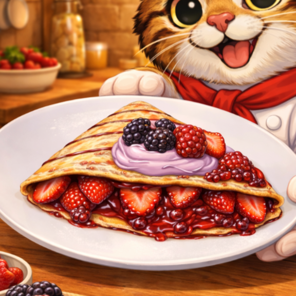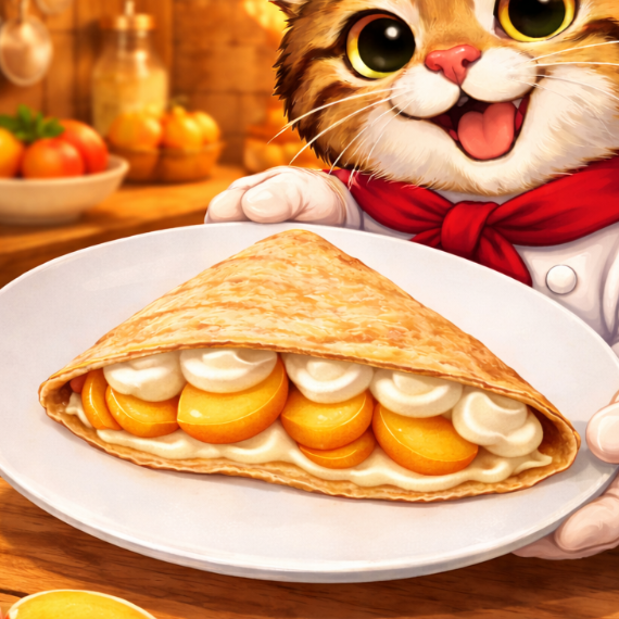 Crepa rellena de durazno, queso crema y crema pastelera.