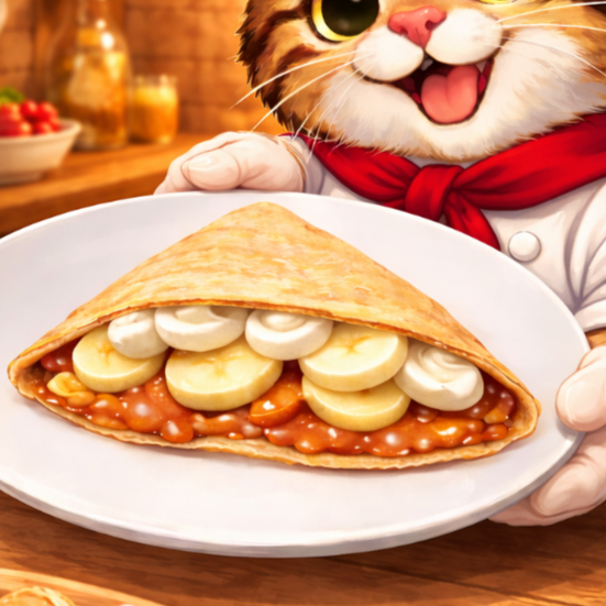 Crepa rellena de queso crema, dulce de leche y platano.