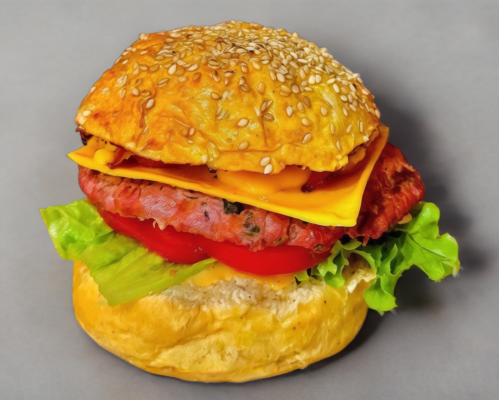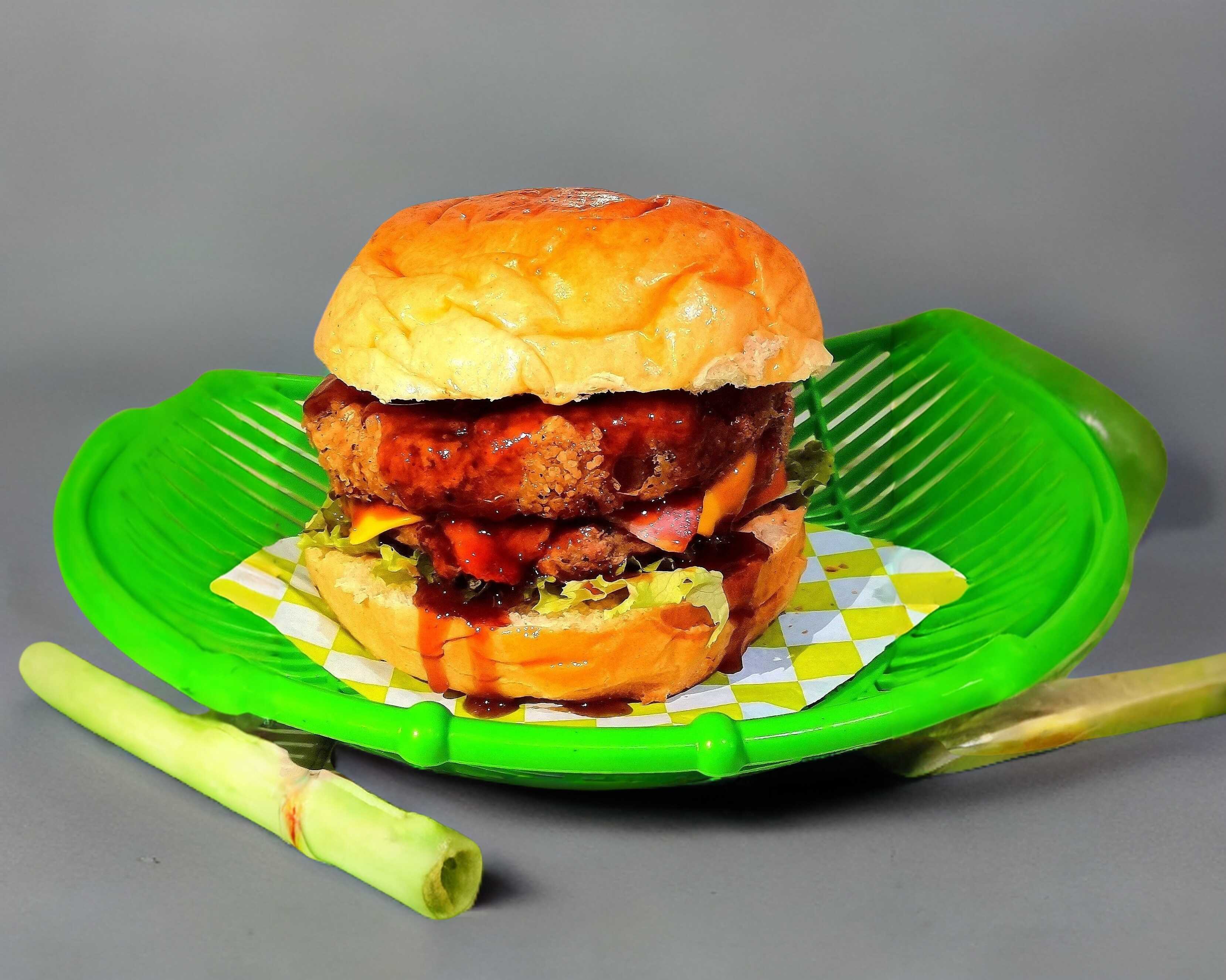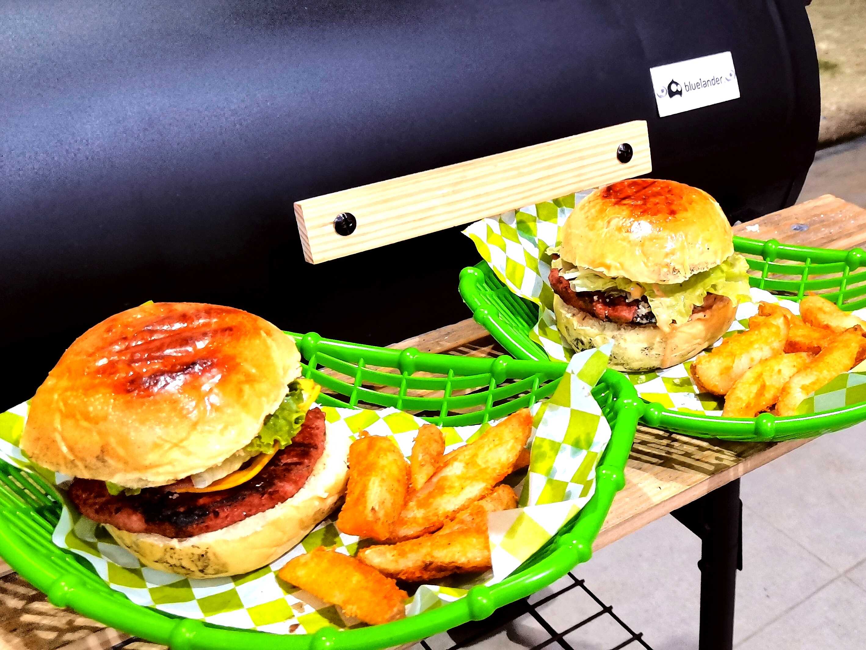 Pan brioche, carne hecha en casa bañada en salsa bbq, queso americano, tocino, aros de cebolla, lechuga, tomate, aderezo de la casa. Acompañado de papas a la francesa