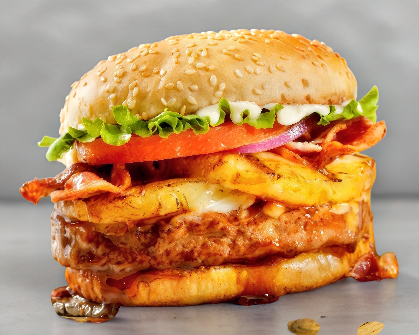 pan brioche, 120 gr de carne marinada, piña asada al grill, tocino, lechuga, tomate, queso americano, queso chedar derretido y aderezo de la casa. Acompañado de papas a la francesa y chile toreado.