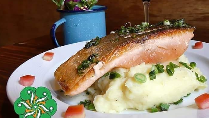 Con puré de papa aromatizado con tocino, queso y cebolla cambray.