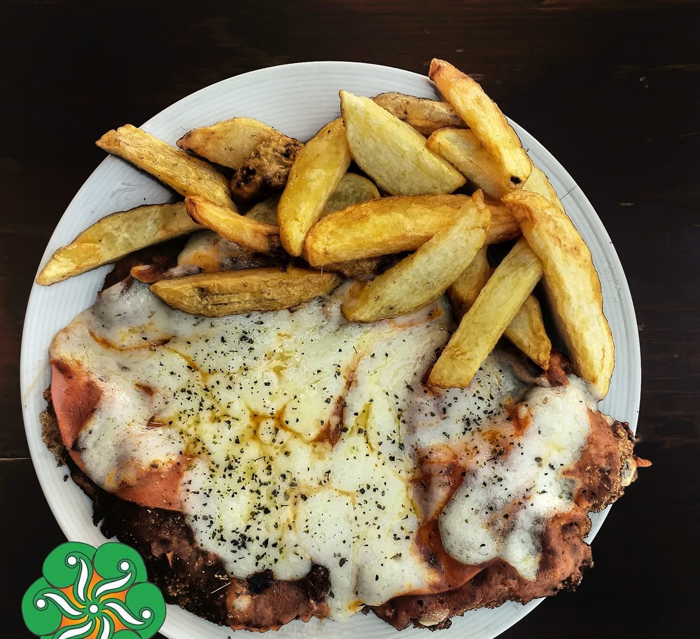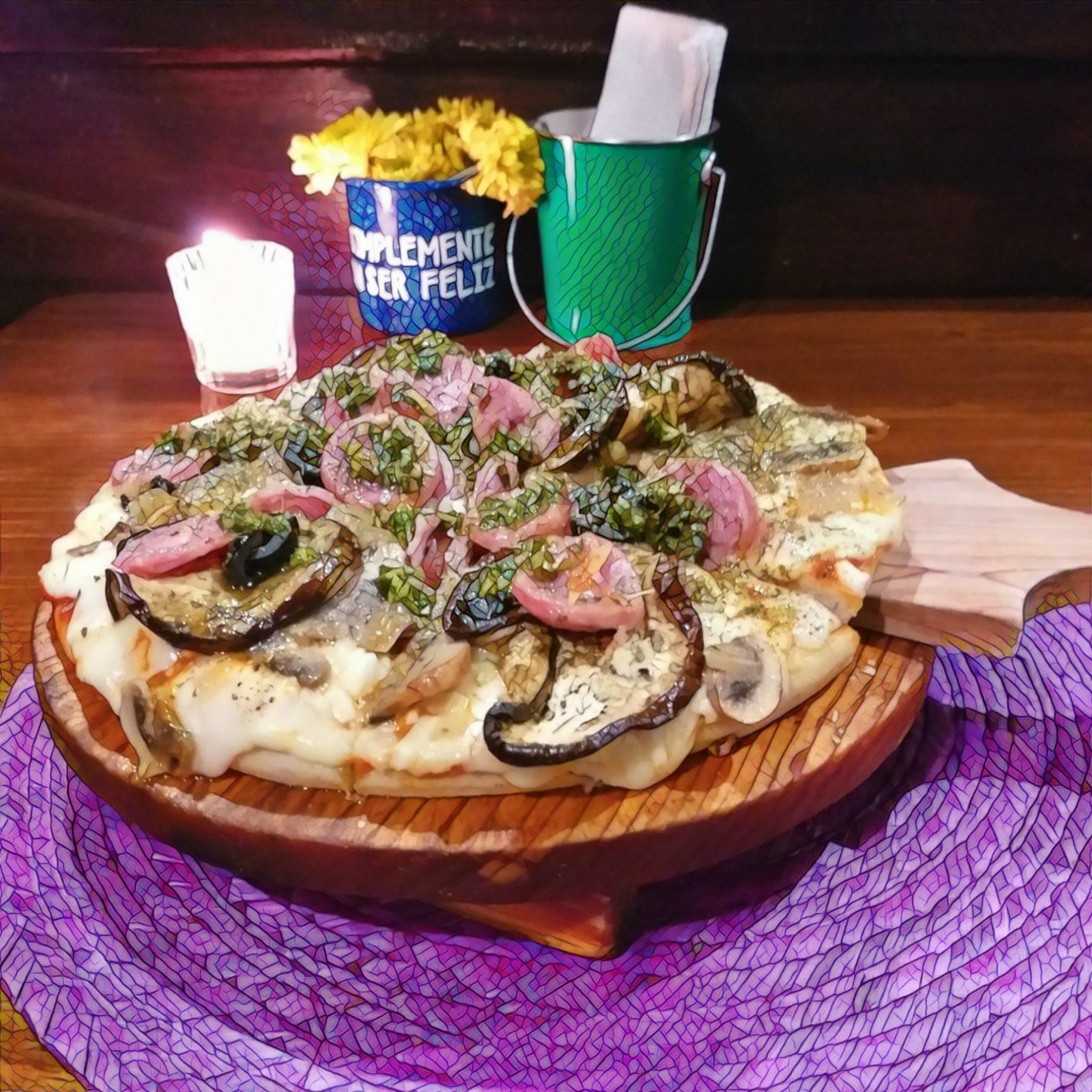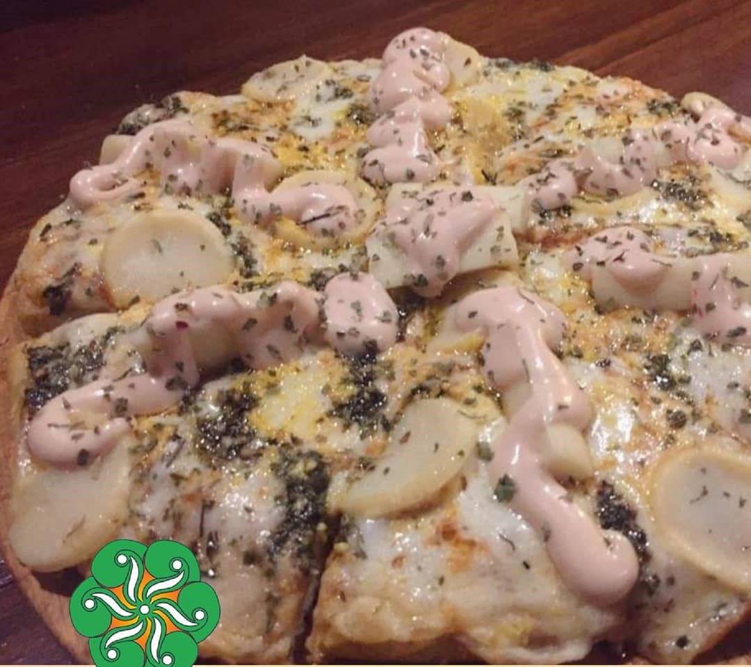 Ingredientes: salsa de tomate, chorizo argentino, queso, berenjenas, champiñones y pesto con parmesano.