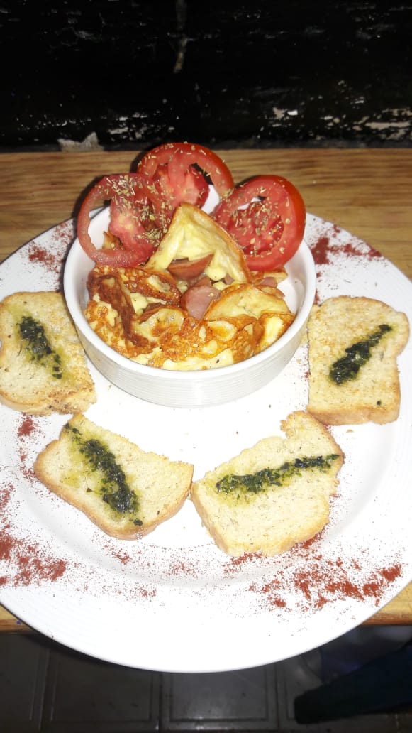 Queso, jamón de pavo, huevo a la plancha, tomate, cebolla y mayochimi.