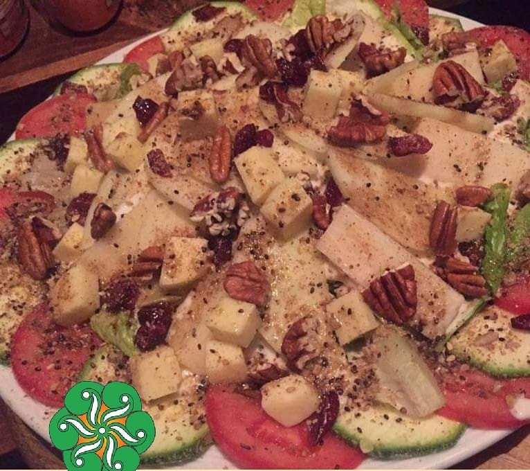 Tomate, lechuga, calabacita, manzana verde, palmitos, nueces, arándanos y aderezo de yogurt.