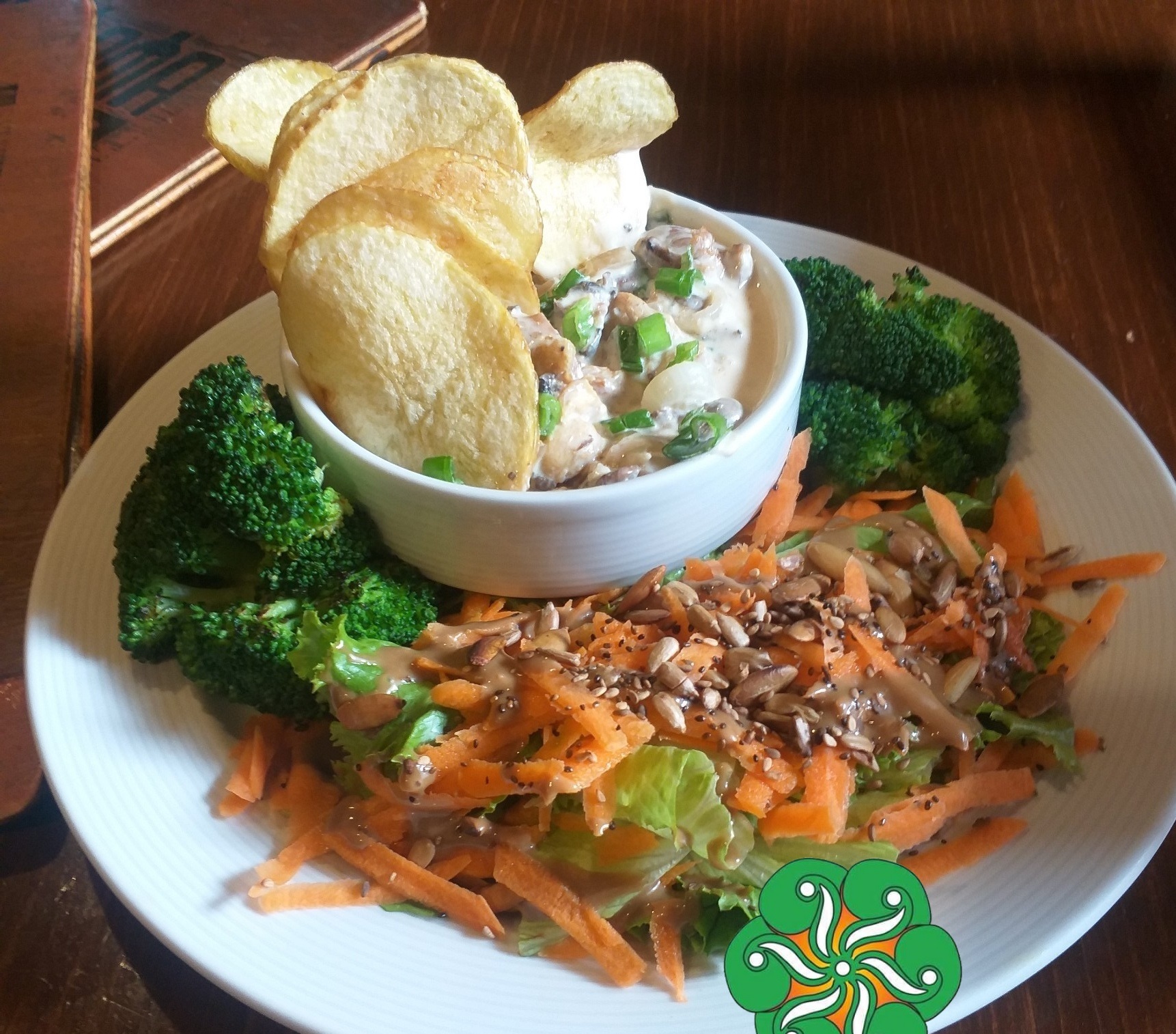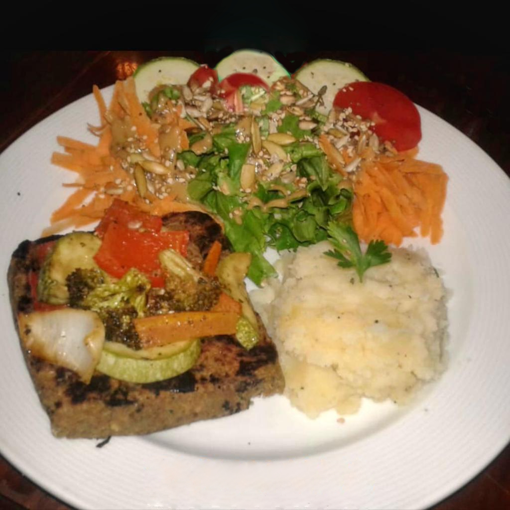 Medallón de quínoa con lenteja con verduras asadas, ensalada y puré.